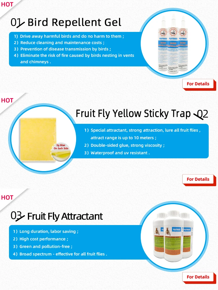 Мы являемся ведущим поставщиком и экспортером продукции для борьбы с вредителями в Китае. Наша компания имеет команду квалифицированных сотрудников, чтобы помочь наших клиентов в выборе товаров. Мы предлагаем широкий ассортимент продуктов на избавляя от укусов комаров Fly, фрукты, тараканов, термитов, клопов и муравья, против грызунов нового дизайна, с рисунком в виде чайки-летучая мышь, под змеиную кожу, и т. д. Мы экспортируем нашу продукцию в более чем в 30 стран до сих пор.