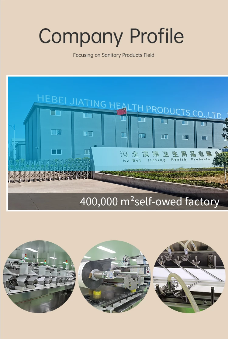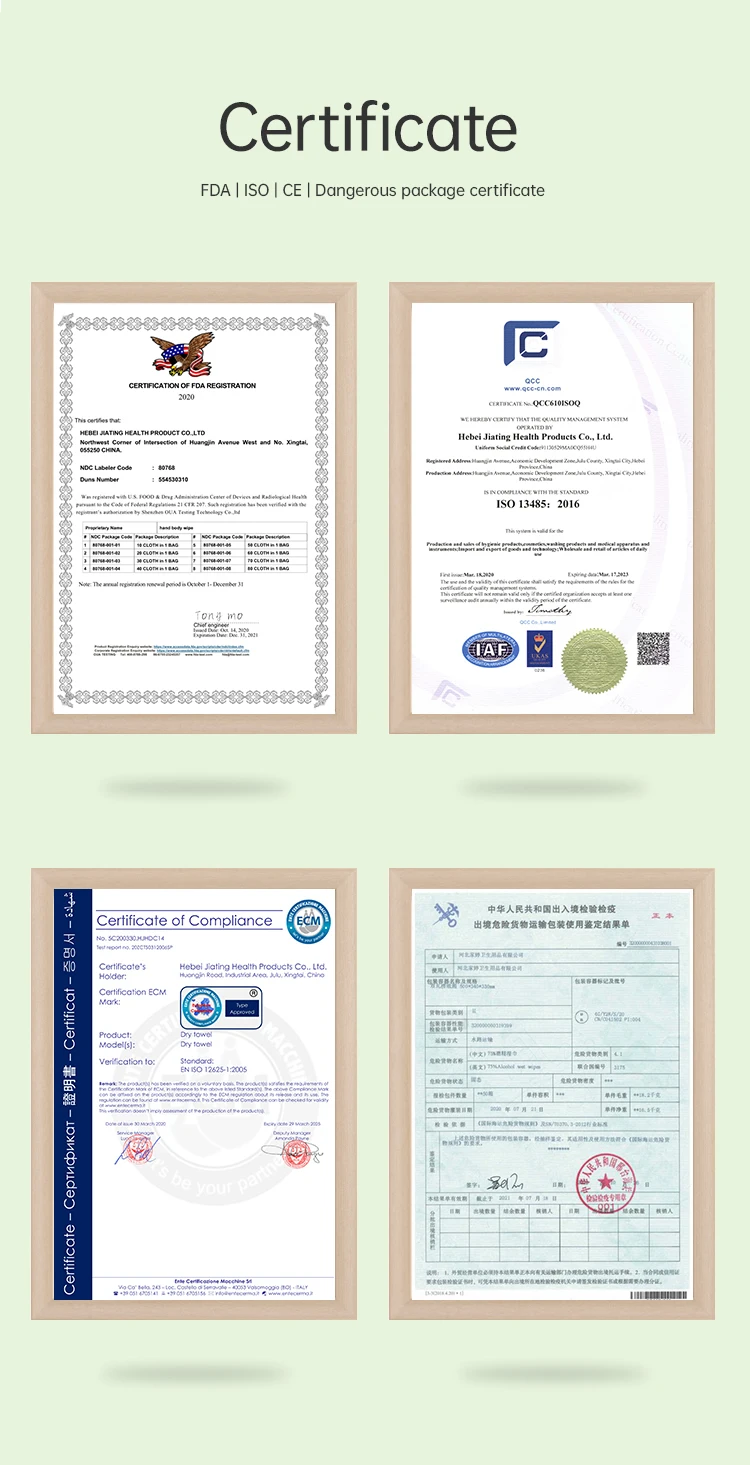 Hebei jiating healthproducts Co.,Ltd covering a total area of about 60 acres, with a dust-free purification workshop of 13,000 square meters, raw material storage of 3,100 square meters, and finished product warehouse of 5,530 square meters.The production workshop is equipped with fresh air system, RO pure water production system, digital remote monitoring system, seven servo high-speed automatic moder wipes production lines, three cotton soft towel production lines, and twenty-nine sets of medical disposable protective clothing production equipment.The company has professional product development, production, operation, sales and management teams, and has passed IS013485 system certification, CE certification, etc.