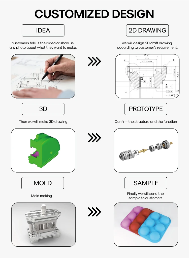 A: Pls send us your graphic design in PDF or AI format.It is great if you have 3D design. If you don’t have any design,you can just send us a sketch or tell us your idea.We will make a design according to your request for your confirmation. A 3D design will be offered in 3 days for your approval after you confirmed the graphic design. Sample mould or/and production mould will be made after the 3D design approved.