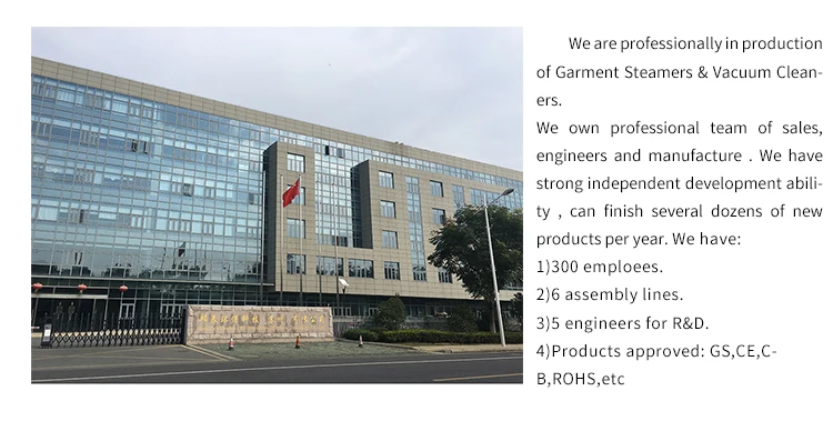 Q1: Are you a factory or trading company? A1: We are the biggest garment steamer factory in China over 10 years. specializing in designing, manufacture and selling of Garment steamers & vacuum cleaners etc. We have been doing ODM and OEM since 2015, now over 2 million PCS garment steamers and vacuum cleaners per year.