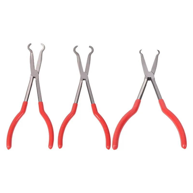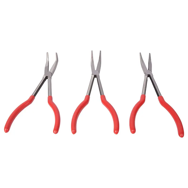11" long reach pliers set includes: Big circle nose, Middle circle nose, Small circle nose, 90 degree needle nose, 45 degree needle nose, Straight needle nose, Flat nose, Power diagonal cutting nose, "S" shape nose