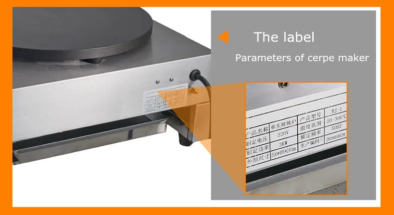 Brand new model of crepe and pancake maker machine. Shell made with full stainless steel. It owns advantages of attractive appearance, novel structure, small volume, light weight, convenient operation and quick and even heat-up. A drawer type warmer is