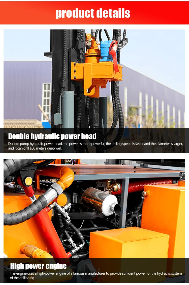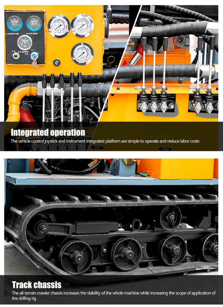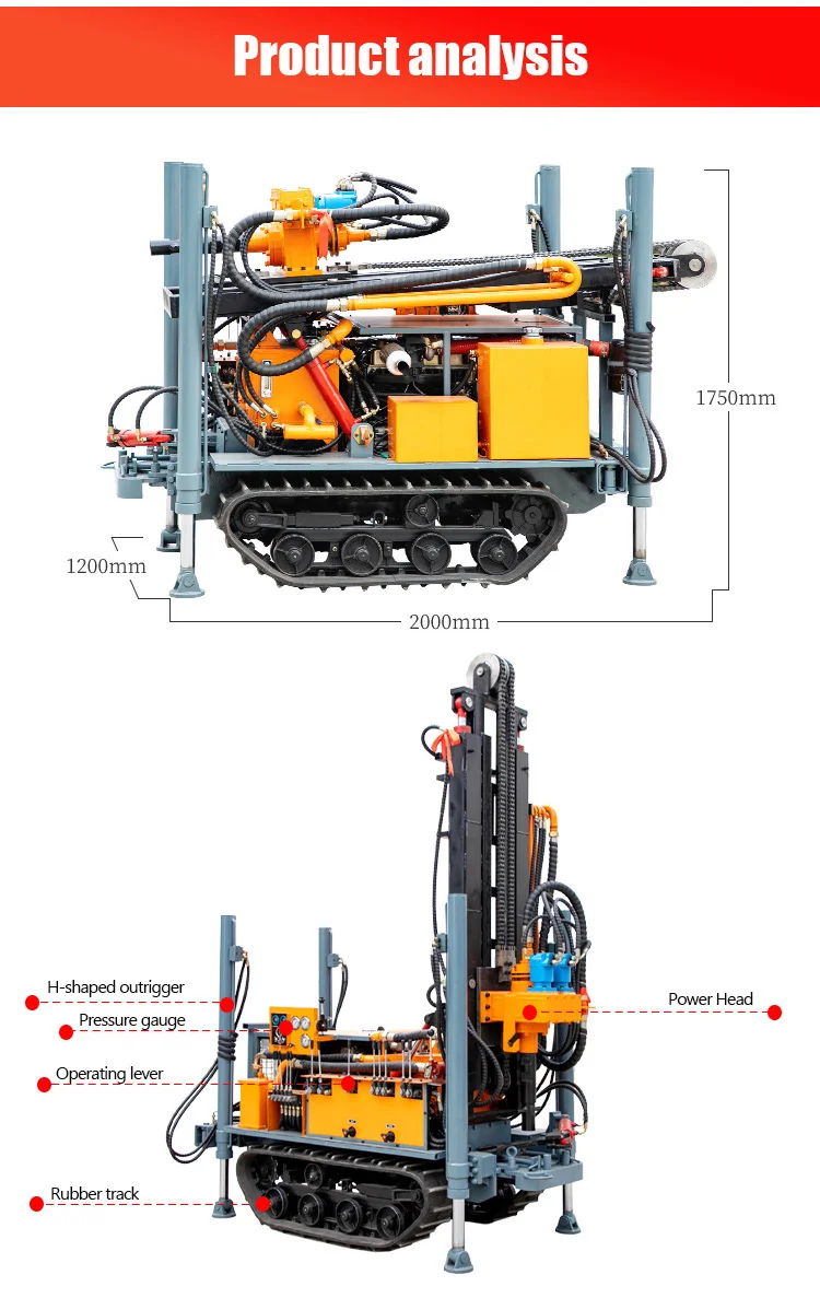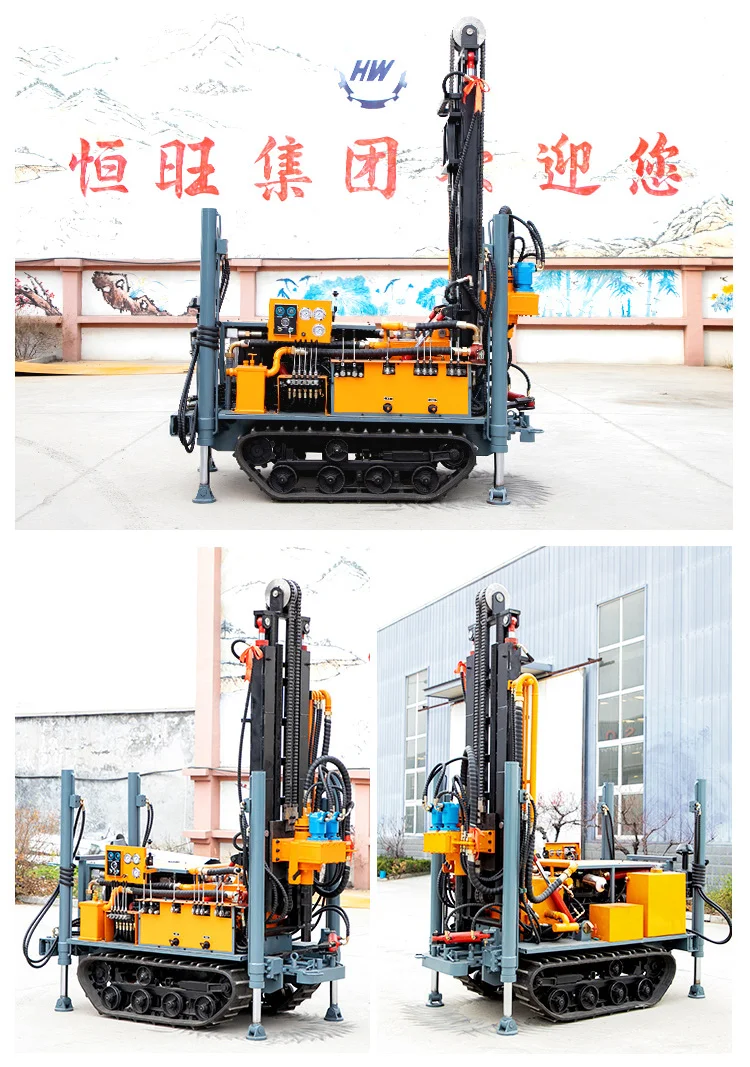 Small crawler self-propelled 150m pneumatic drilling rig can be applied to various strata, used in water well engineering, geothermal well, anchor pile hole and so on, and can be used with follow-pipe drilling. Small crawler self-propelled 150m pneumatic drilling rig has the advantages of whole machine hydraulic control, automatic loading and unloading drill pipe, crawler type chassis, large horsepower diesel engine, four hydraulic support leg balance, stronger terrain application ability and so on.