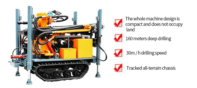 Small crawler self-propelled 150m pneumatic drilling rig is a lightweight, efficient and multifunctional drilling equipment , it is mainly applicable to industrial and civil drilling, geothermal drilling, has the advantages of compact structure, fast advancing, mobile and flexible wide application region etc.. Small crawler self-propelled 150m pneumatic drilling rig is especially suitable for water intake in mountainous and rocky strata.