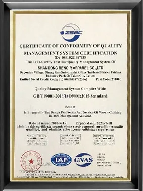 Shandong Harmony Apparel Co., Ltd is a professional garment manufacturer which is located in Tai an City ,Shandong ,China. our factory covers an area of 17755 square and hires more than 600 workers, it has 1147 sets of sewing equipment, finishing equipment, cutting equipment which are imported form Germany ,Japan and other countries to from the world’s advanced level suits production line. it has an annual production capacity of 1000000 sets. Now, we have several products including high-grade fusing suits, half-canvas suits, work wears , blazers, trousers, coats and so