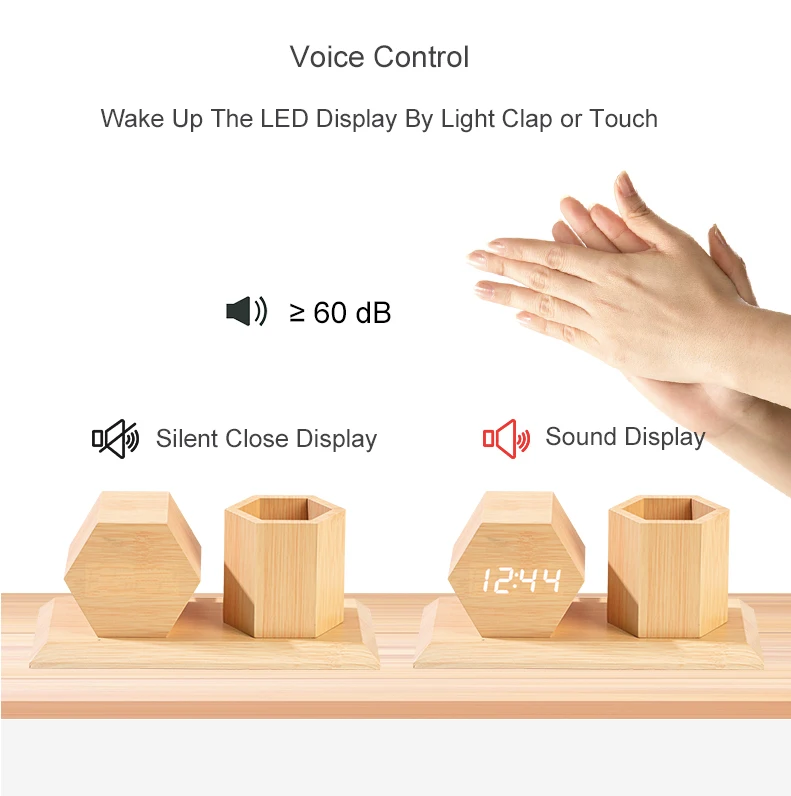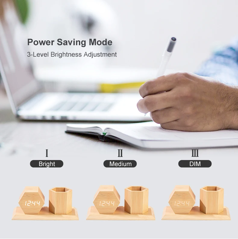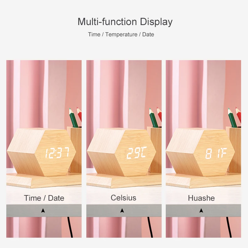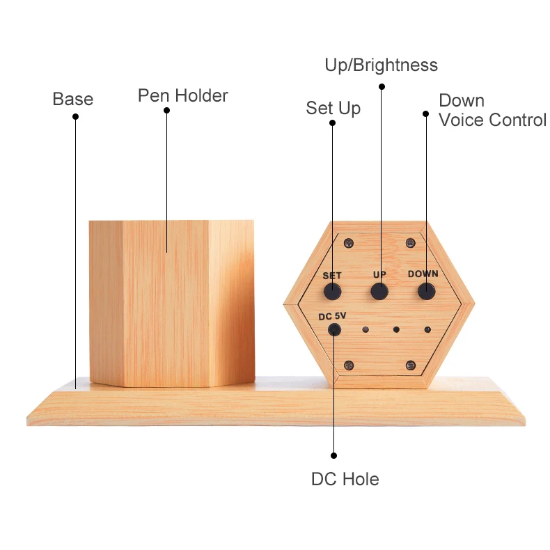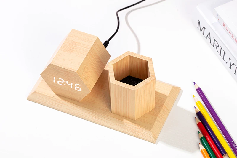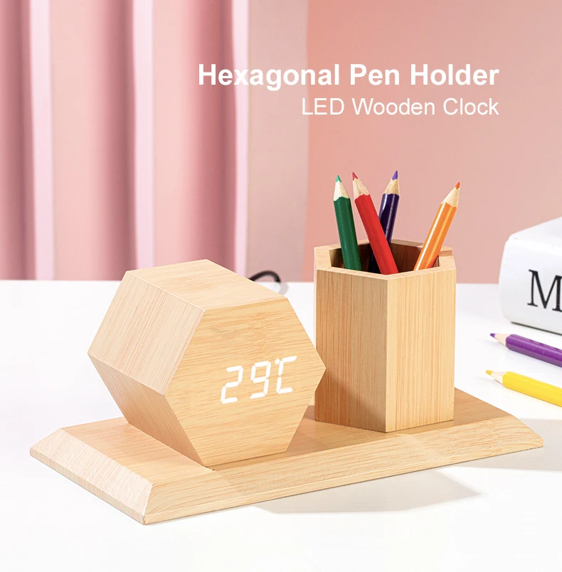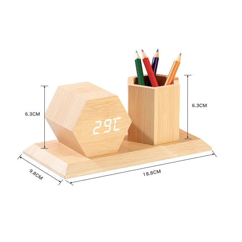 Product Name | Wooden Table Wholesale Alarm Clock with Hexagonal Pen Holder | ||||