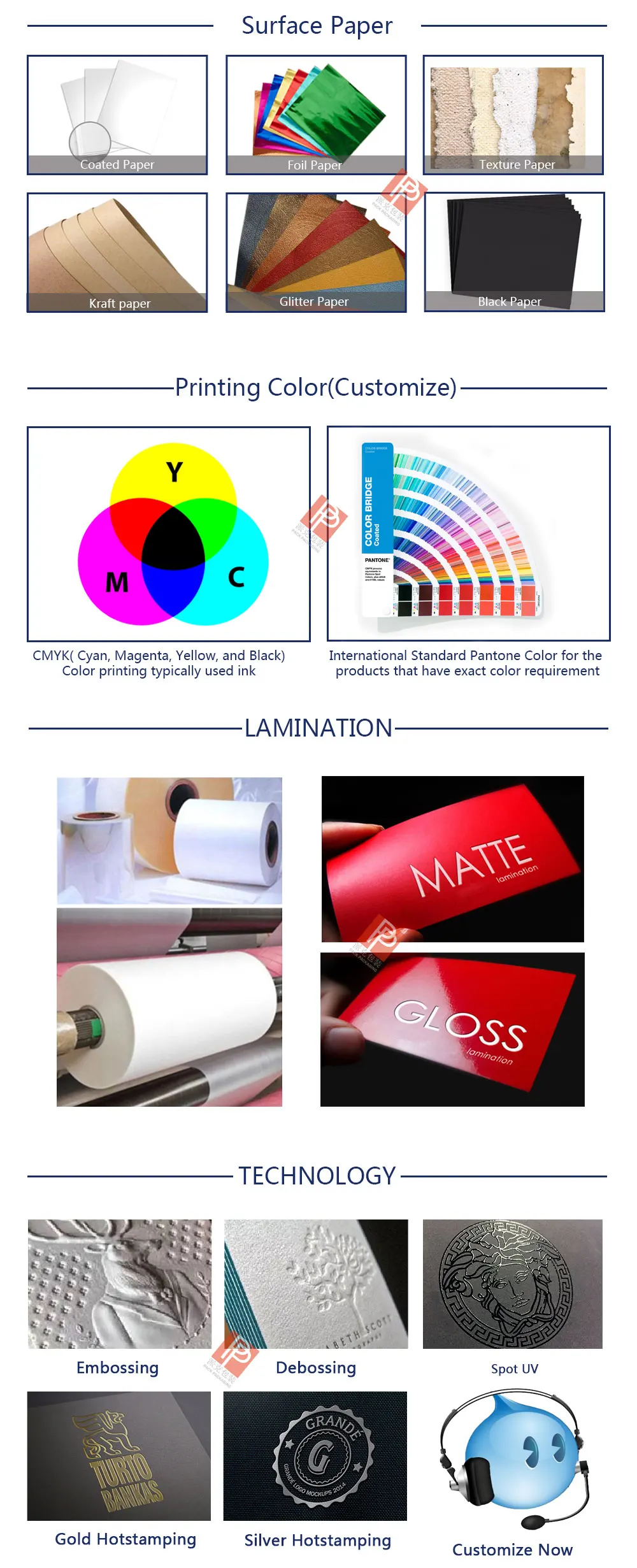 Logo / Text | Hot foil stamping, UV printing, Debossing etc. |