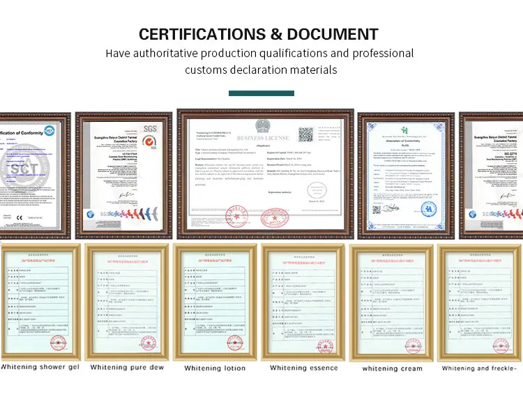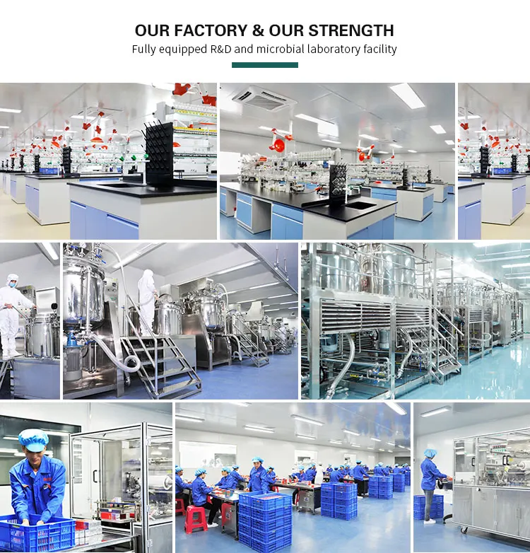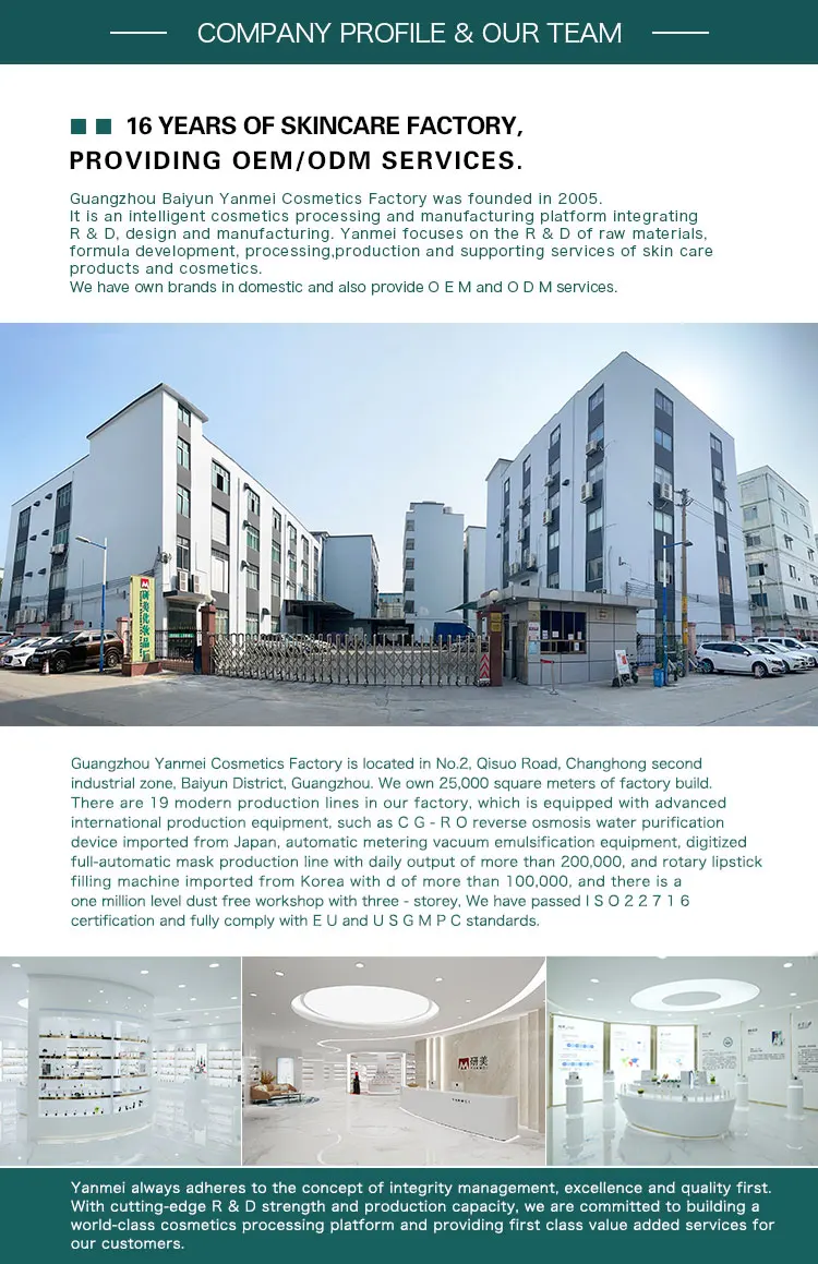 1 | 25000 Square meters of custom processing base 100,000 level purification workshops Certified by GMPC,SGS,MSDS,ISO22716 19 modern production lines, 2 laboratories 49 units of import advanced equipment. 8 production workshops,Around 300 employees |