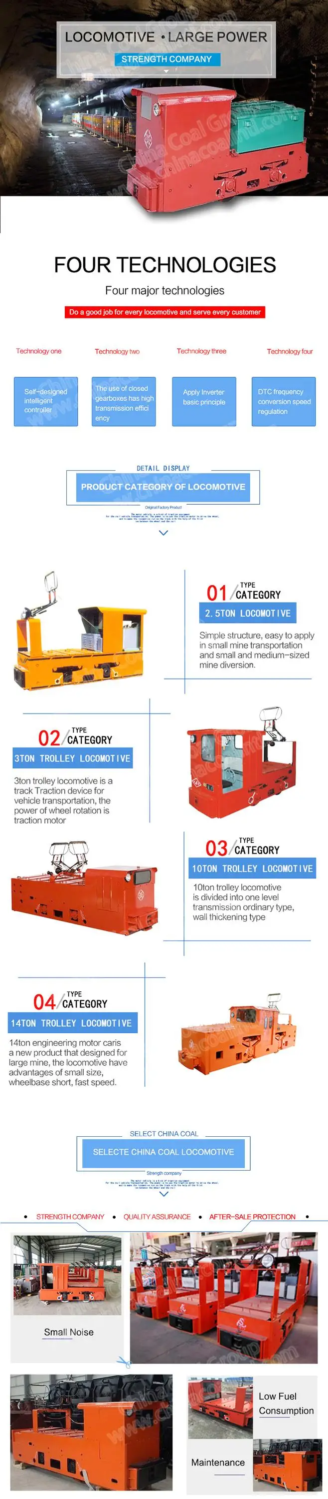 Basing on special advantage in the field of mining equipment control system and advanced technology of AC frequency conversion , we have developed wide range of electrical locomotives :battery powered and trolley type from 2.5 tons through to 55 tons suitable for various track gauge including 600mm, 762mm, 900mm and 1435mm. with the unique feature such as the cab available in three designs : one side type , central type and in Tandem Operation type ; Locomotives with Radio Remote Control ; and Explosion proof locomotive. some of Models passed MA certificate , mainly service for tunneling , mining , shield construction and related industrial applications . All locomotives are track tested prior to shipment to ensure reliable operation and safe control.