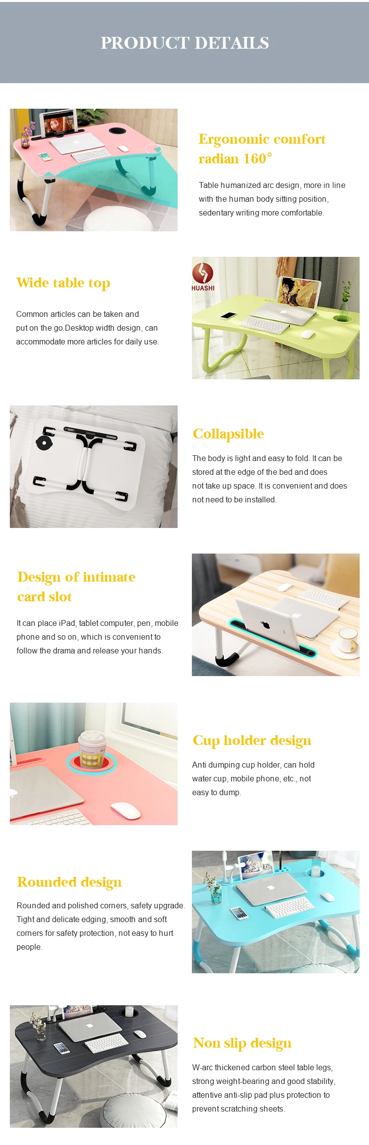 A: Usually for portable folding laptop table our MOQ is 200PCS. But we accept lower quantity for your trial order. Please feel free to tell us how many pieces you need and we will calculate the cost correspondingly. Hoping you can place large orders after checking quality of our products and know our service.
