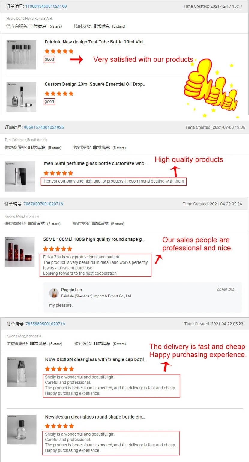 A:For most projects,please kindly make sure all the details, such as bottle weight,pump size,cap material/weight,or glass bottle decoration method, printing requirements and quantity, we can provide you with a price quote within 24hours.