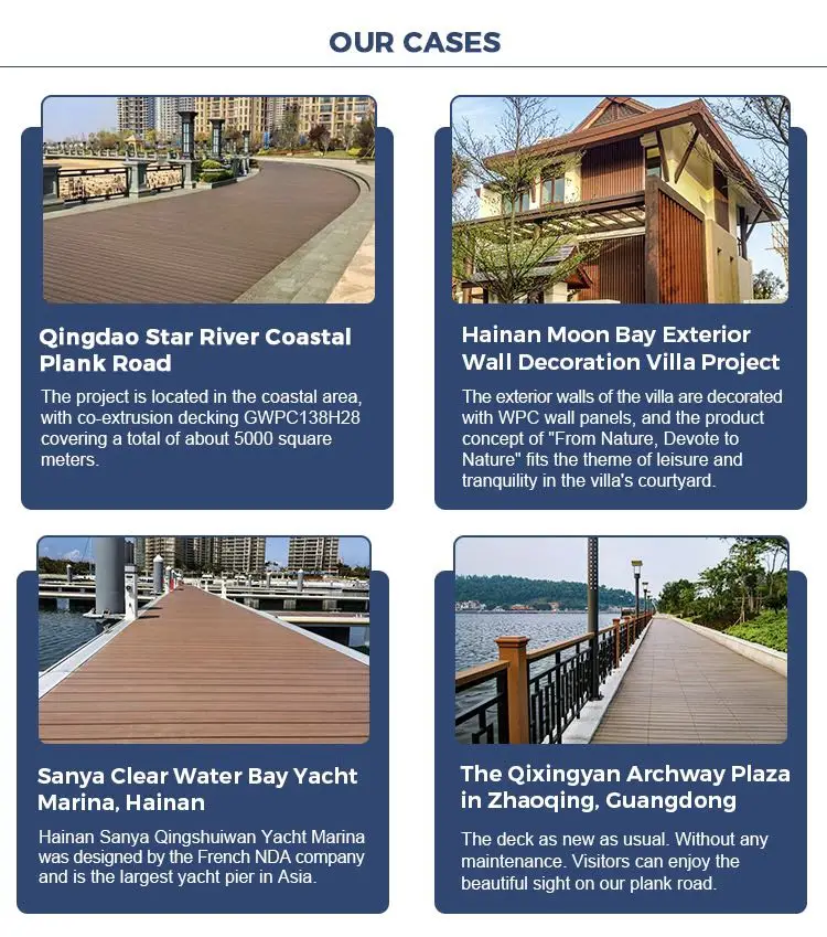 2.Compare to real wood,what are the advantages of WPC? Waterproof,Fire-retarding,Termite proof,Recycled,Natrue wood grain,Easy to