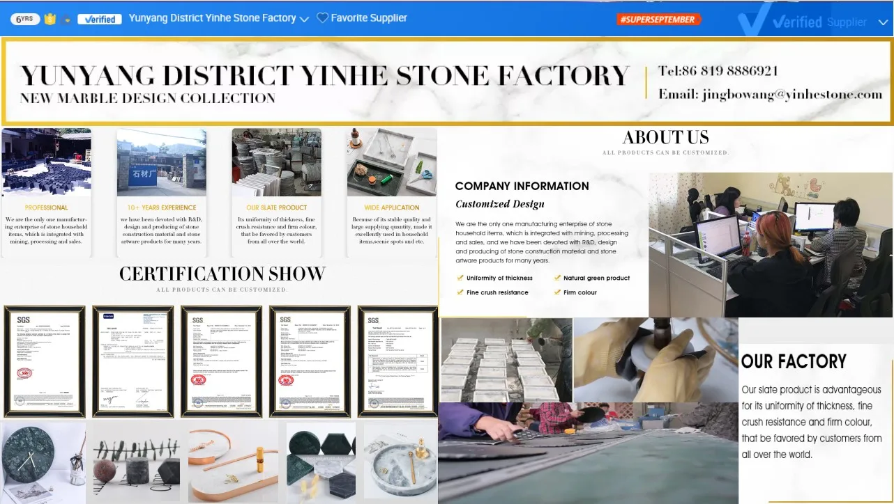 Yun county Yinhe Stone Factory was established early in 1995, the old name is "Yunxian Yinhe Jade&carving accessories factory", which is located in centre region of China, Shiyan, Hubei province. We are the only one manufacturing enterprise of stone household items, which is integrated with mining, processing and sales, and we have been devoted with R&D, design and producing of stone construction material and stone artware products for many years.