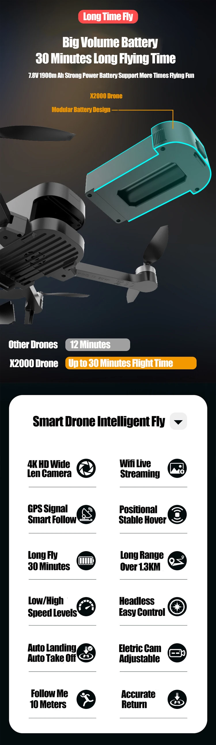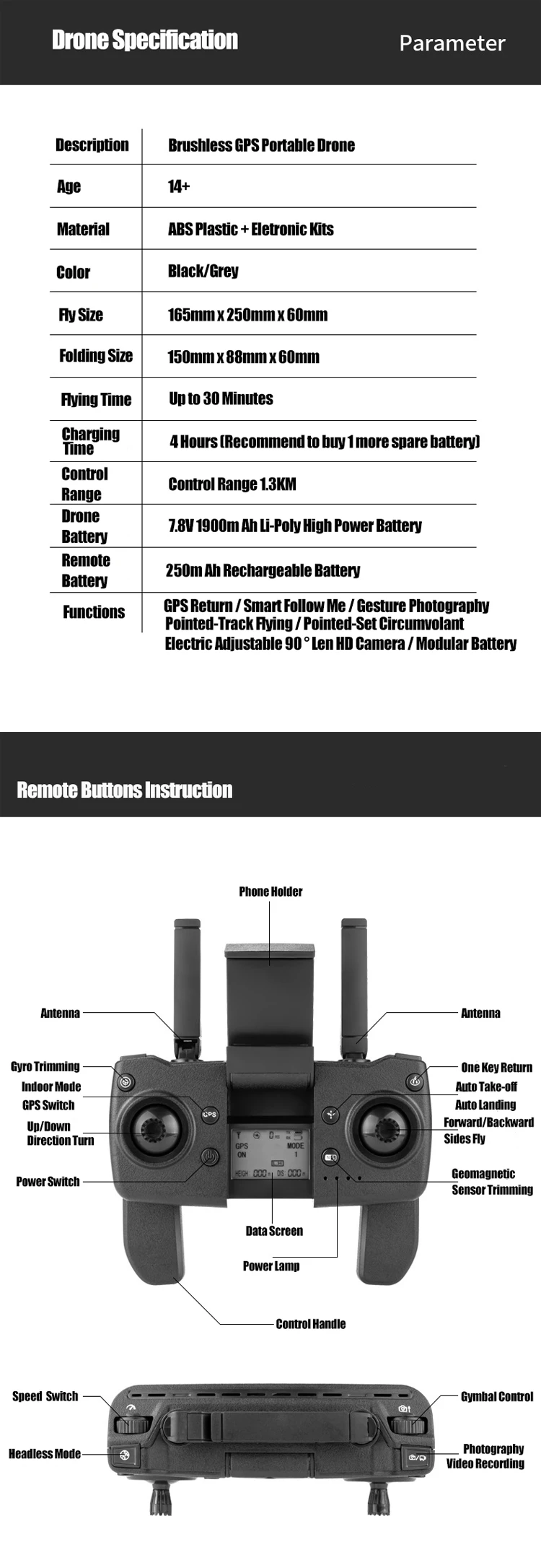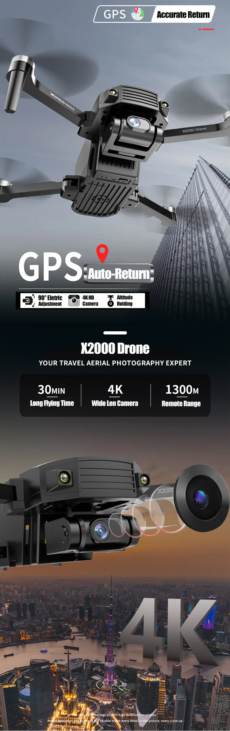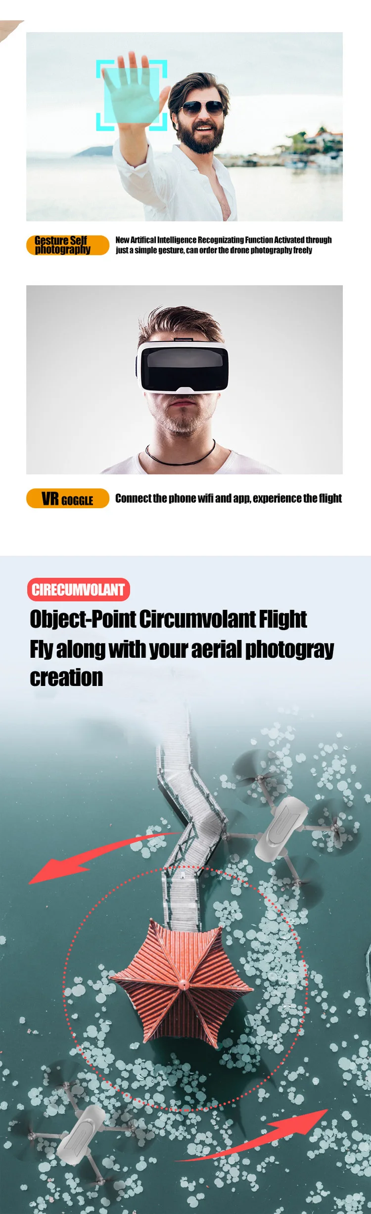 Function: GPS Auto Return; Follow Me; Circumvolant Flight; Gesture Photography; Point/Position Setting Flight; Durual Camera
