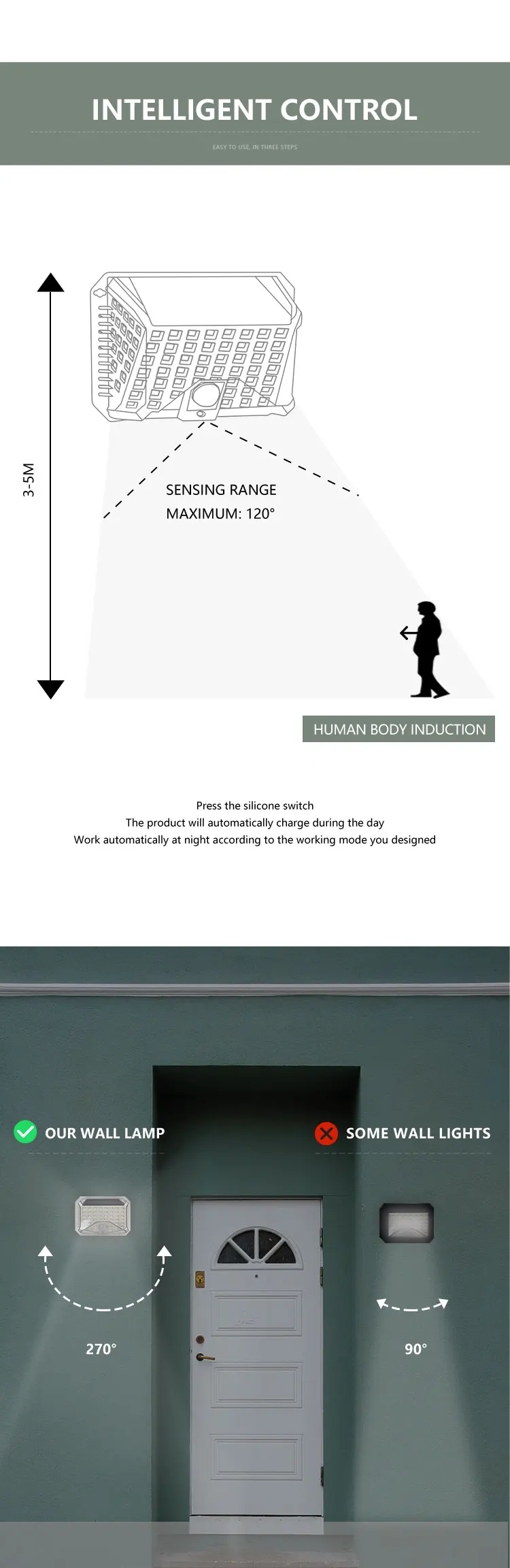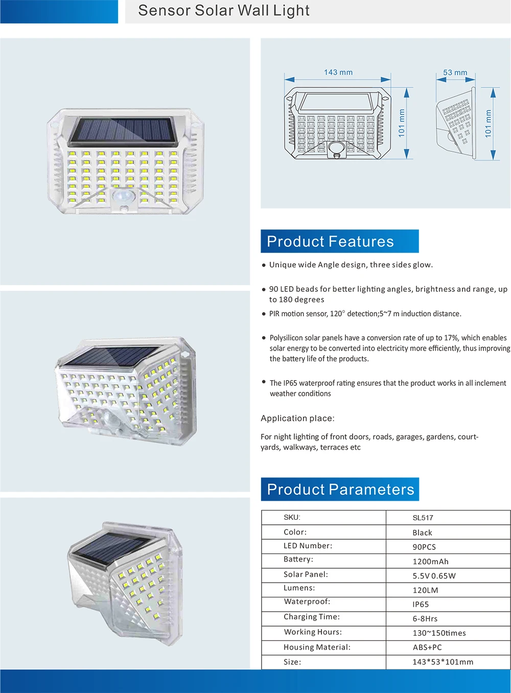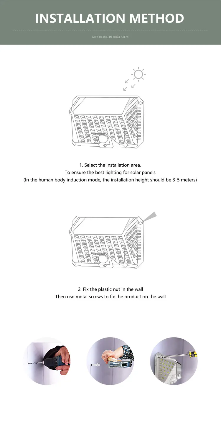 3 | Work Mode | 1. Light Sensor; 2. Motion Sensor: High-Low; 3. Motion Sensor: High-Off | 16 | Product Material | ABS | |||||