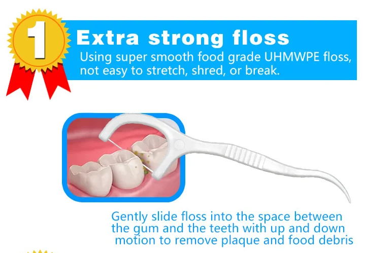 1. Super smooth and strong floss 2. Easy grip handle 3. Can be used as toothpick | |