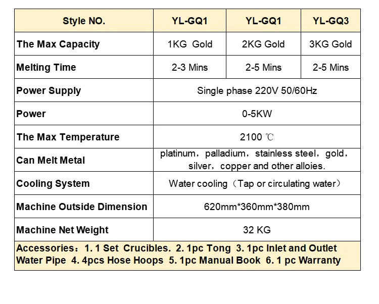 Technical Parameters of 2100 Degrees 3KG Gold Smelter Iron Stainless Steel Silver Platinum Precious Metal Melting Machine For Sale With Water Pump | ||||||