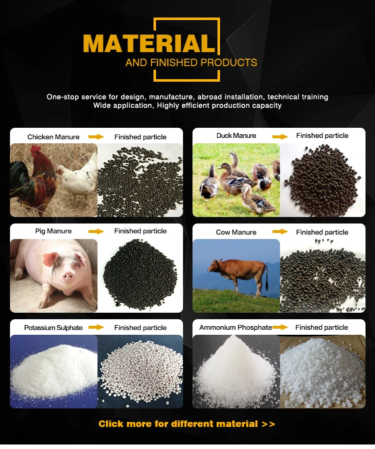 A:We are a professional manufacturer for producing fertilizer processing equipment and related machine(fermentation machines,granulator, crusher, mixer, packing, feeding machines and conveyor belt) etc. |
