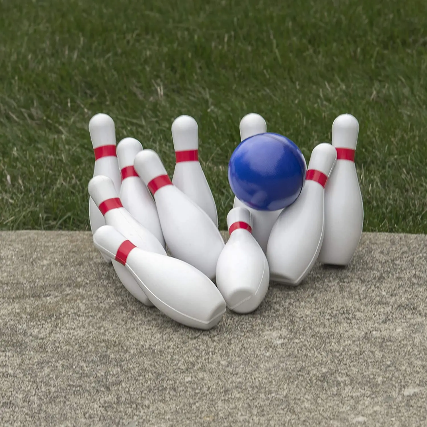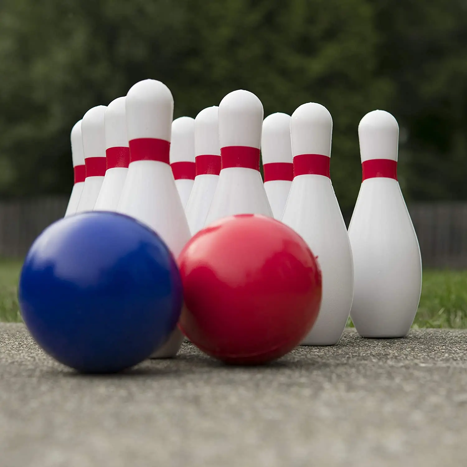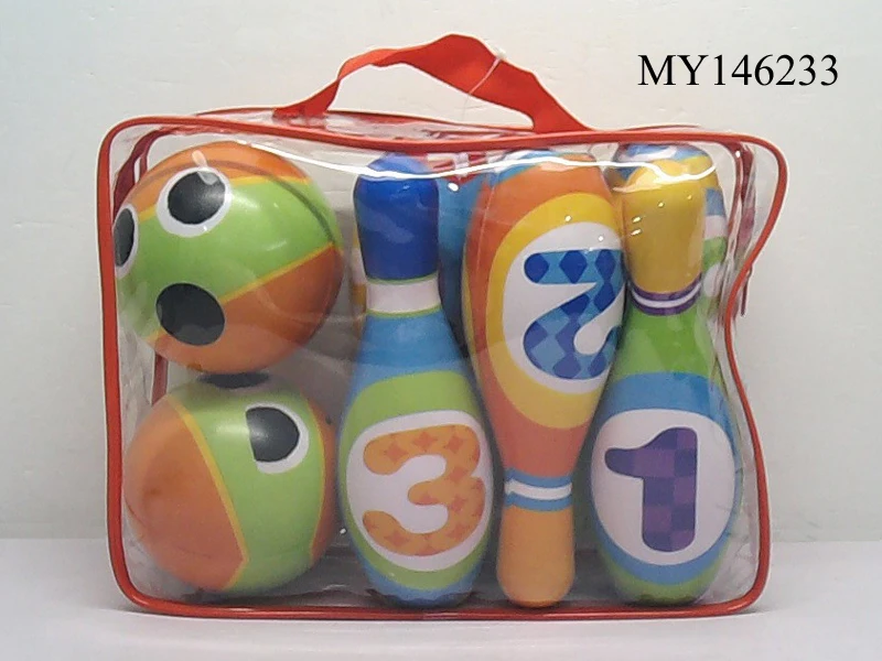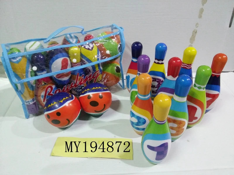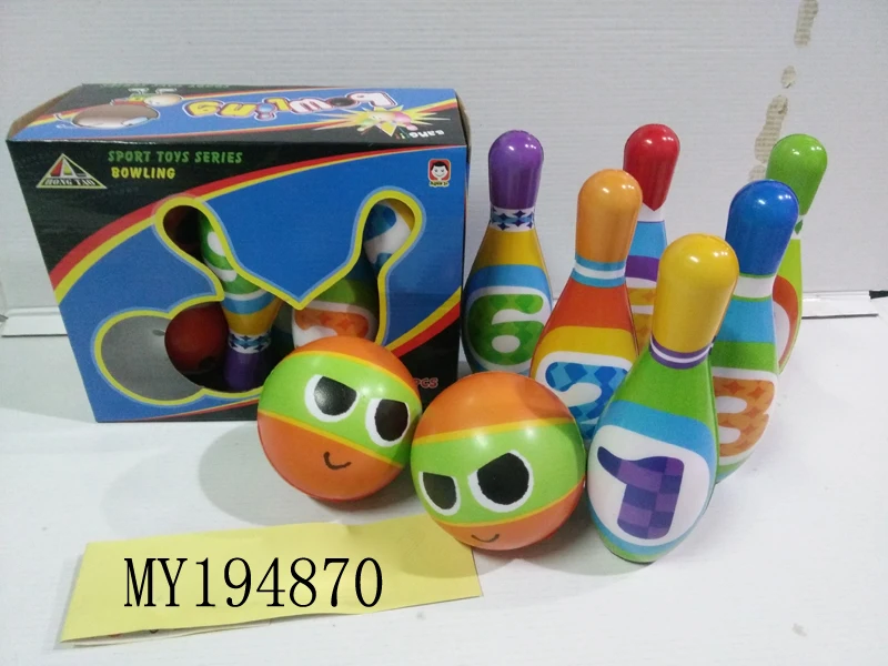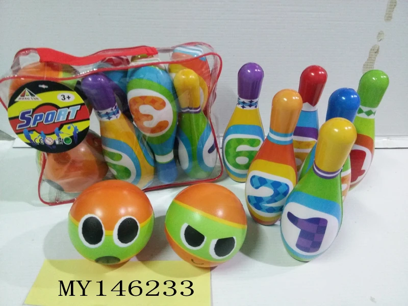 10 bowling pins approx. 7.5" and 2 bowling ball approx. 4” in diameter