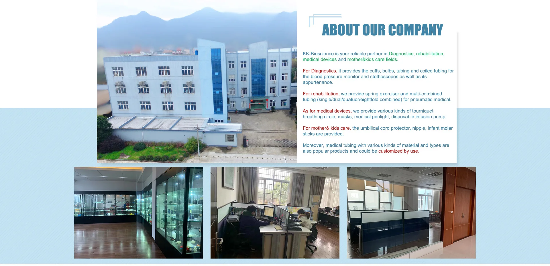 For the past 30 years, KK-Bioscience, together with its mother company, has become your reliable partner in Diagnostics, rehabilitation, medical devices and mother&kids care fields. For Diagnostics: it provides the cuffs, bulbs, tubing and coiled tubing for the blood pressure monitor and stethoscopes as well as its appurtenance. For rehabilitation, we provide spring exerciser and multi-combined tubing (single/dual/quatuor/eightfold combined) for pneumatic medical. As for medical devices, we provide various kinds of tourniquet, breathing circle, masks, medical penlight, disposable infusion pump. For mother& kids care, the umbilical cord protector, nipple, infant molar sticks are provided. Moreover, medical tubing with various kinds of material and types are also popular products and customized by use.