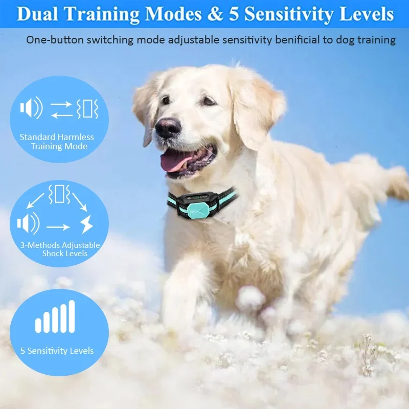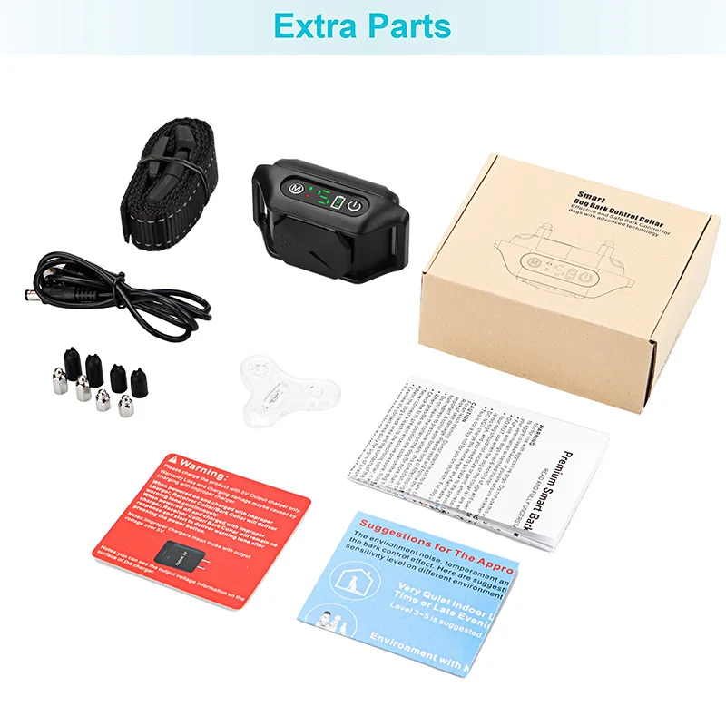 Product Type | Rechargeable Dog Bark Collar | Modes | Dual Working Modes: 1.Warning Tone + Vibration 2.Warning Tone + Vibration + Shock 3.Test Mode |