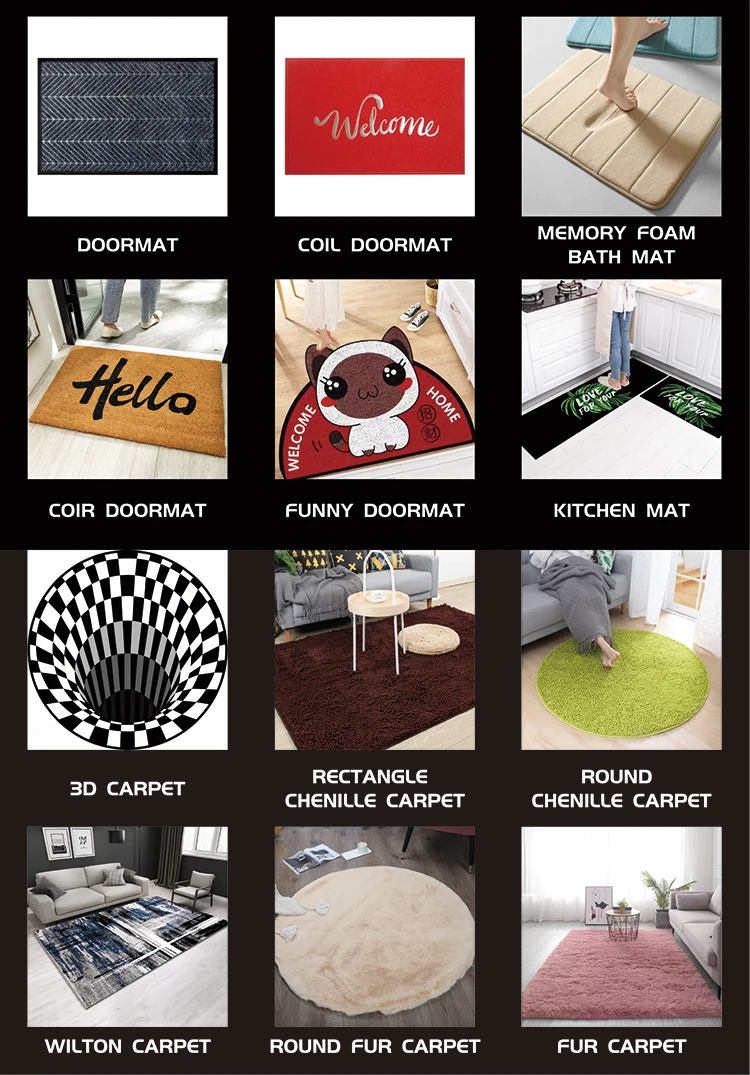 A:We are an environmentally friendly mat manufacturer,We can supply you at least 30 kinds of carpet.including:living room carpet.door mat.bath mat and other luxury carpet. Strictly quality control system and reasonable price help you won competitive market.
