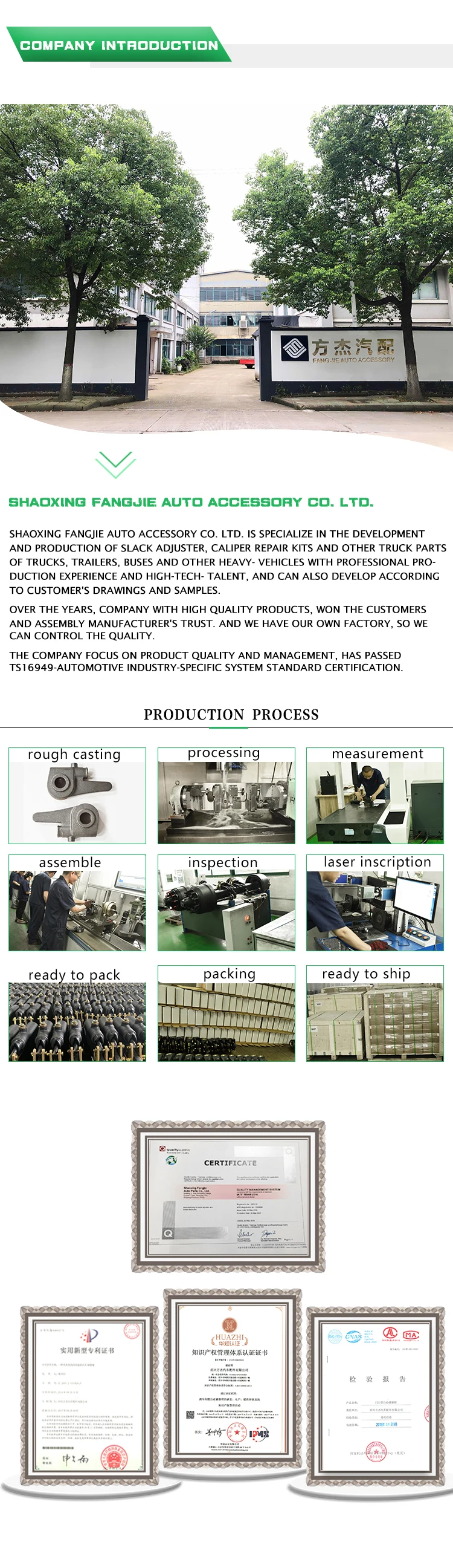Our company is a professional manufacturer with solid technical teams, advanced craftsmanship and a complete set of inspection equipment. We produce and export automatic slack adjusters for heavy autos like trucks, trailers and passenger cars and other parts of chassis system.