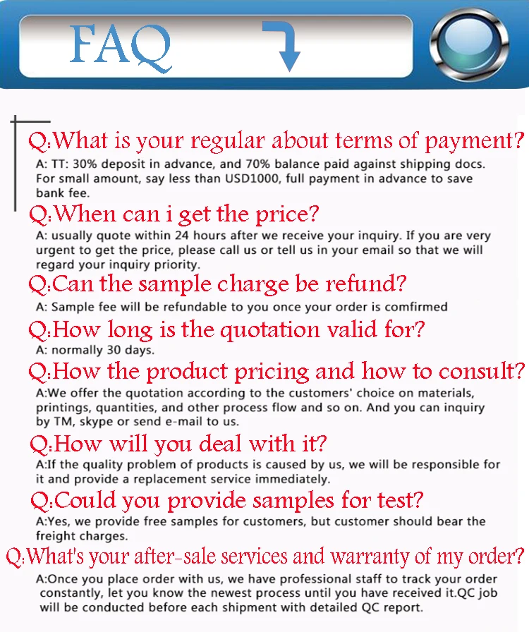 8)Delivery time | 24-48 hours for stock,5-10 working days after sample confirmation for OEM order | |