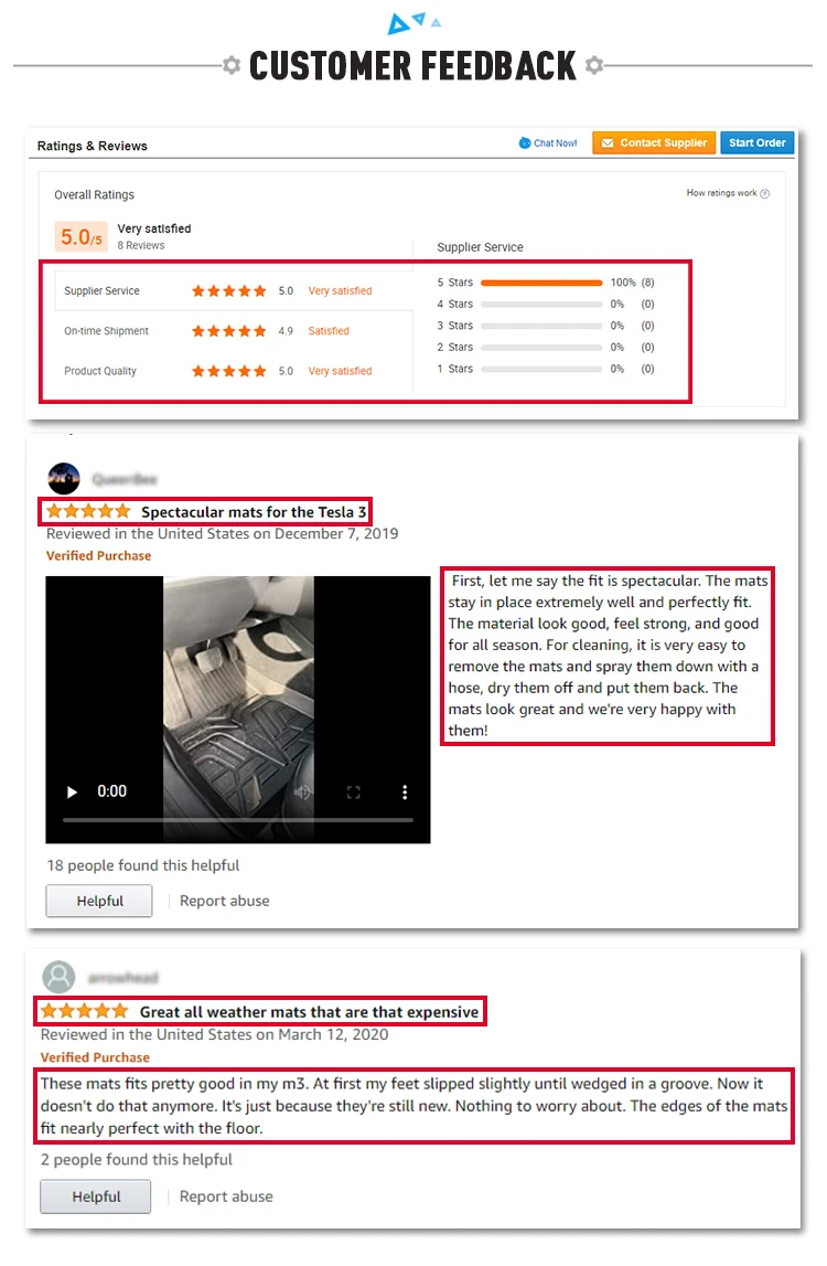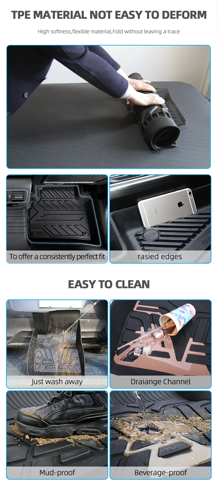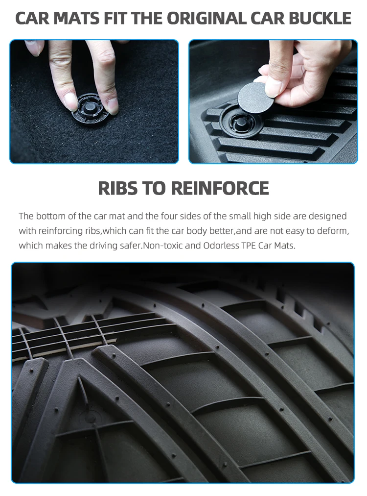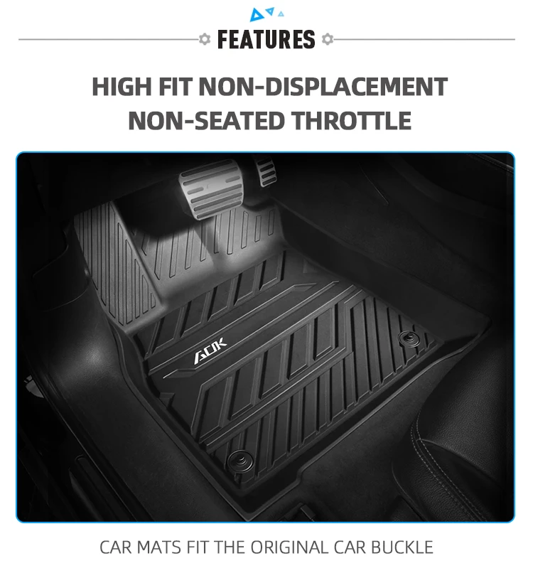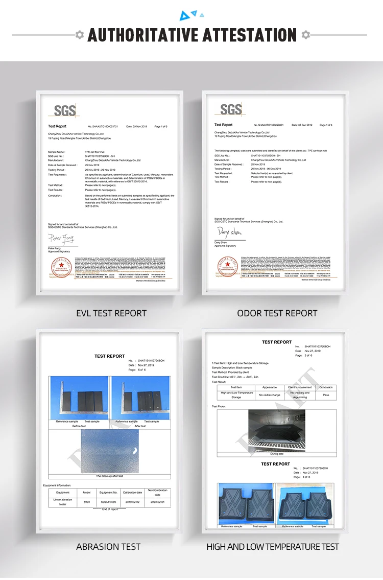 *Package contents | 1 x front All Weather Floor Mats(driver side) 1 x front All Weather Floor Mats( passenger side) 1x rear back row Floor Mat | *Tests Passed | SGS Test for Sensorial examination Odour test , SGS Test for Hi -low temperature Test, SGS Test for Abrasion Resis -tance Test |