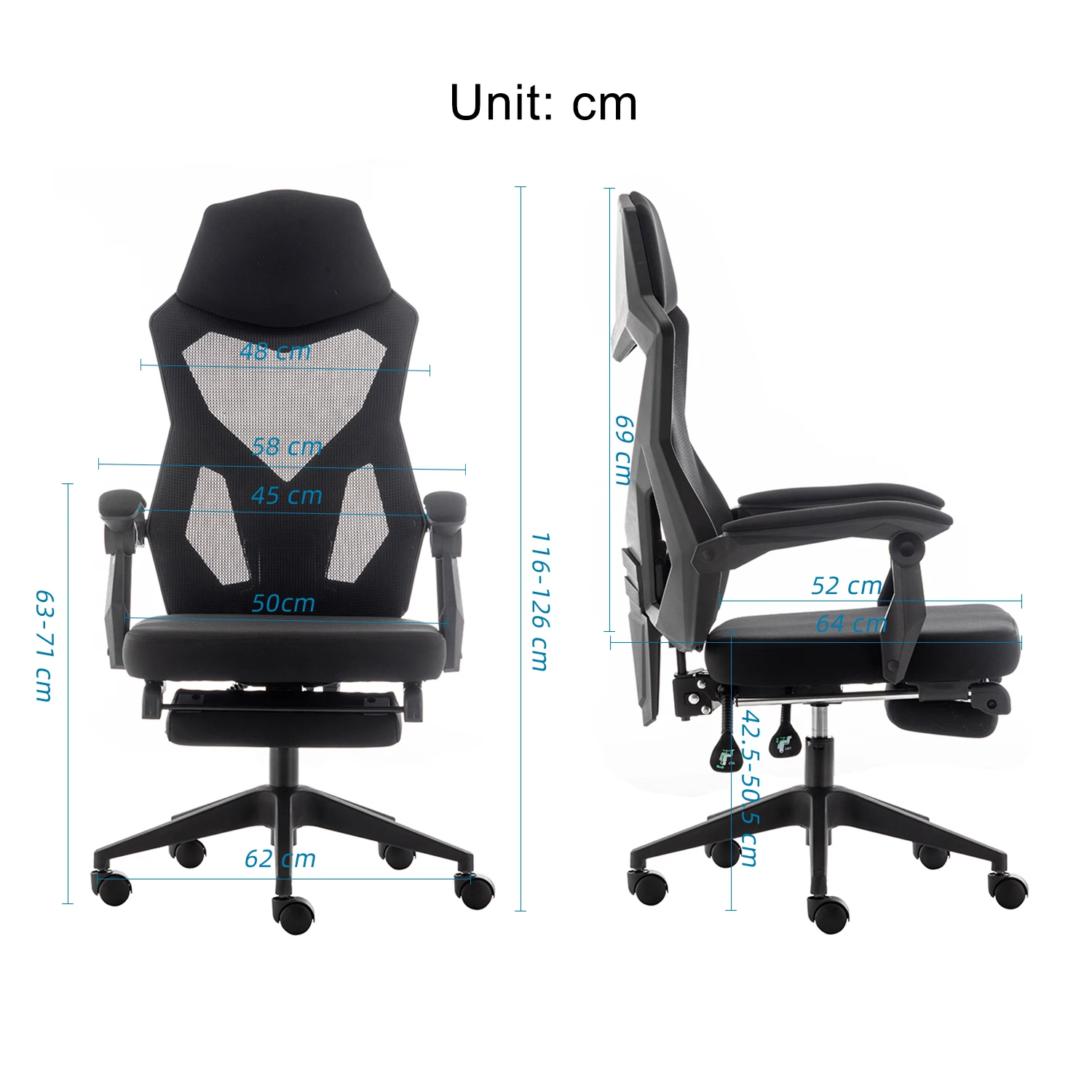 80mm class 2 gaslift, Ergonomic Recliner: 90-135 degree, armrest and headrest with soft padded,comfortable mesh,pu universal wheel, with footrest | |