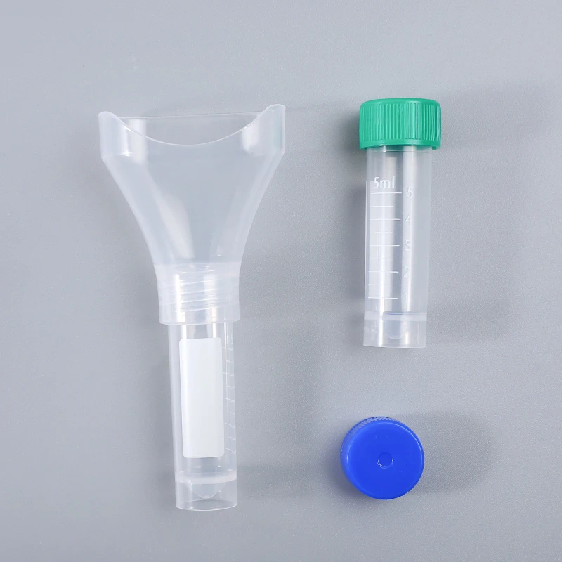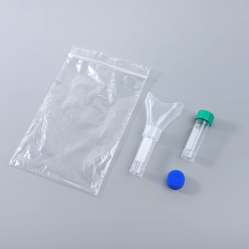 Usage | 1.Rinse mouth with water 30 minutes before sampling 2.Slowly spit out saliva into the funnel until it reaches the mark of 2ml 3.Unscrew the funnel part counterclockwise 4.Twist the blue cap clockwise and shake it gently for 5 seconds to fully mix the saliva and preservation solution 5.Put the collected test tubes in biosafety packaging |