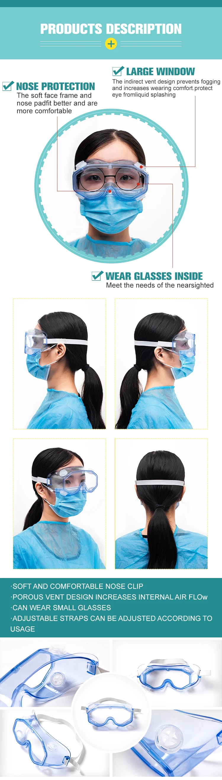 Features | 1.Light weight and comfortable to wear 2.clear high definition anti-fog material 3.Good waterproof and dustproof effect 4.Designed to fit perfectly to the eye 5.Excellent protection against potential contamination from blood pathogens, body fluids, or harmful chemical splash. | ||||||