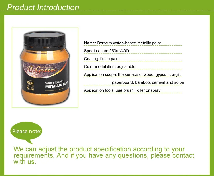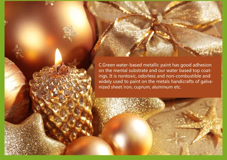 Чернила на водной основе металлическая краска-это своего рода Высококачественная архитектурных покрытий, изготовлен из металлического порошка, такие как медный порошок, алюминиевый порошок как пигмент. Он имеет металлический простой смысл, может улучшить качество здания, а также отображать благородных, элегантные темпераментные плиссированные закрытые туфли полностью. Он не токсичен, защита от воды, с сильной укрывистостью и адгезионная сила. Это экологический продукт, который экспортируется во многие страны и регионы. В настоящее время мы находимся в долгосрочной перспективе Сделано в Китае для многих клиентов в США, Австралия, Япония, Германии, Франции. |