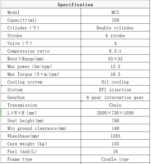 Engine Type | 250cc double cylinder |