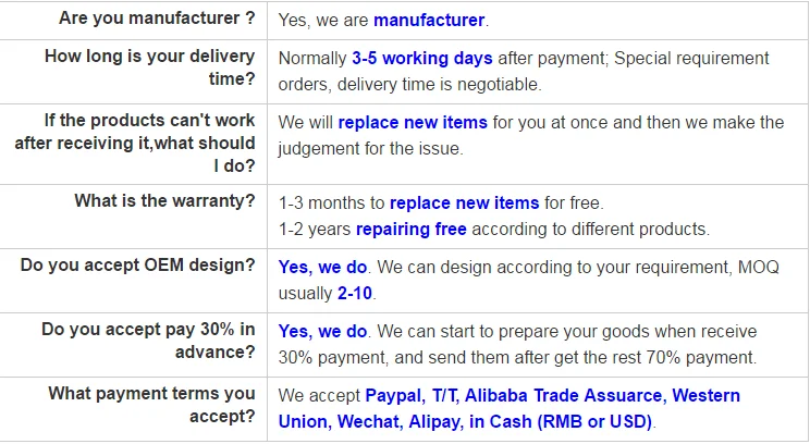 We accept 30% TT and L/C at sight. For T/T payment,production willstart after receiving 30% prepayment.The rest of payment should becompleted before shipment.