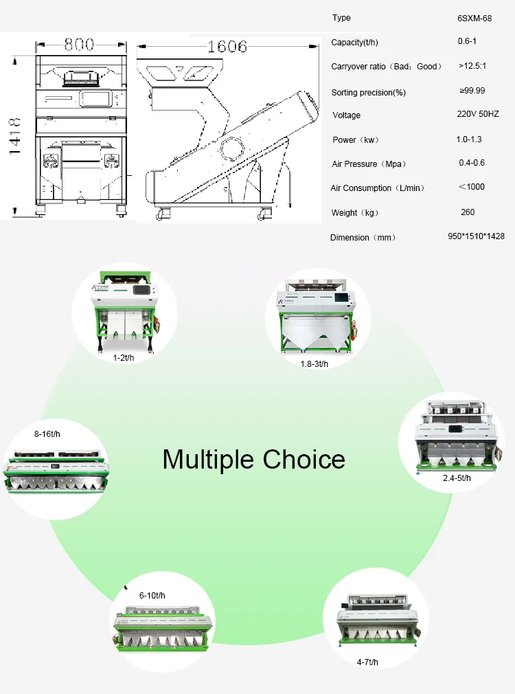 Этот многофункциональный аппарат для сортировки и может быть использован для зерна, кукуруза, бобы, арахис, семена, лекарственных трав, пшеницы, орехи, кофе, вишня, перец, морские продукты и другие25000 + Продукты.