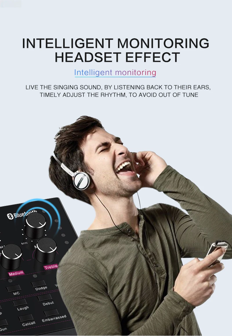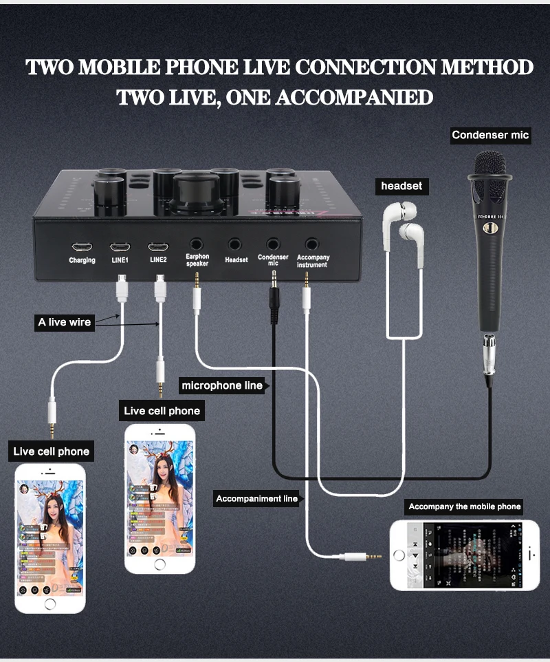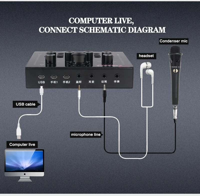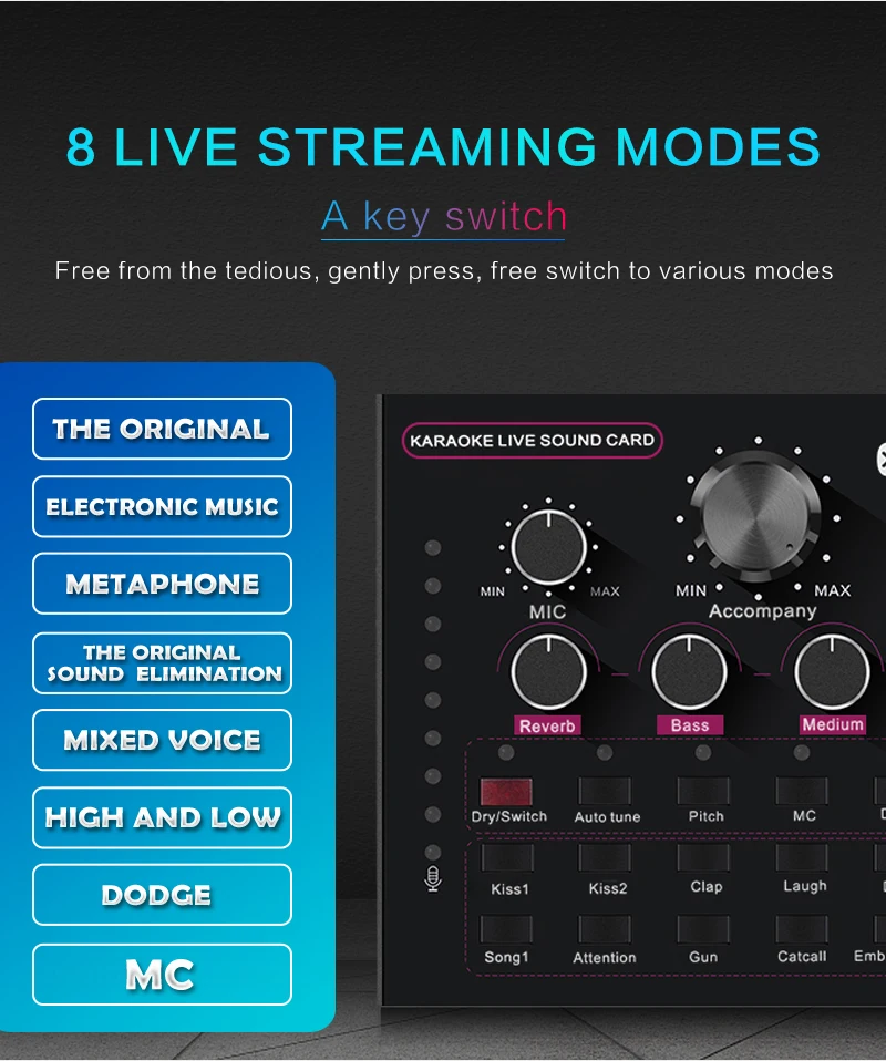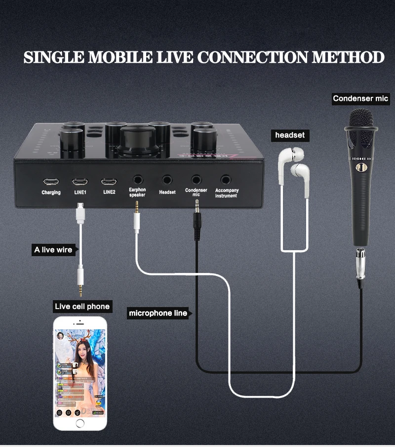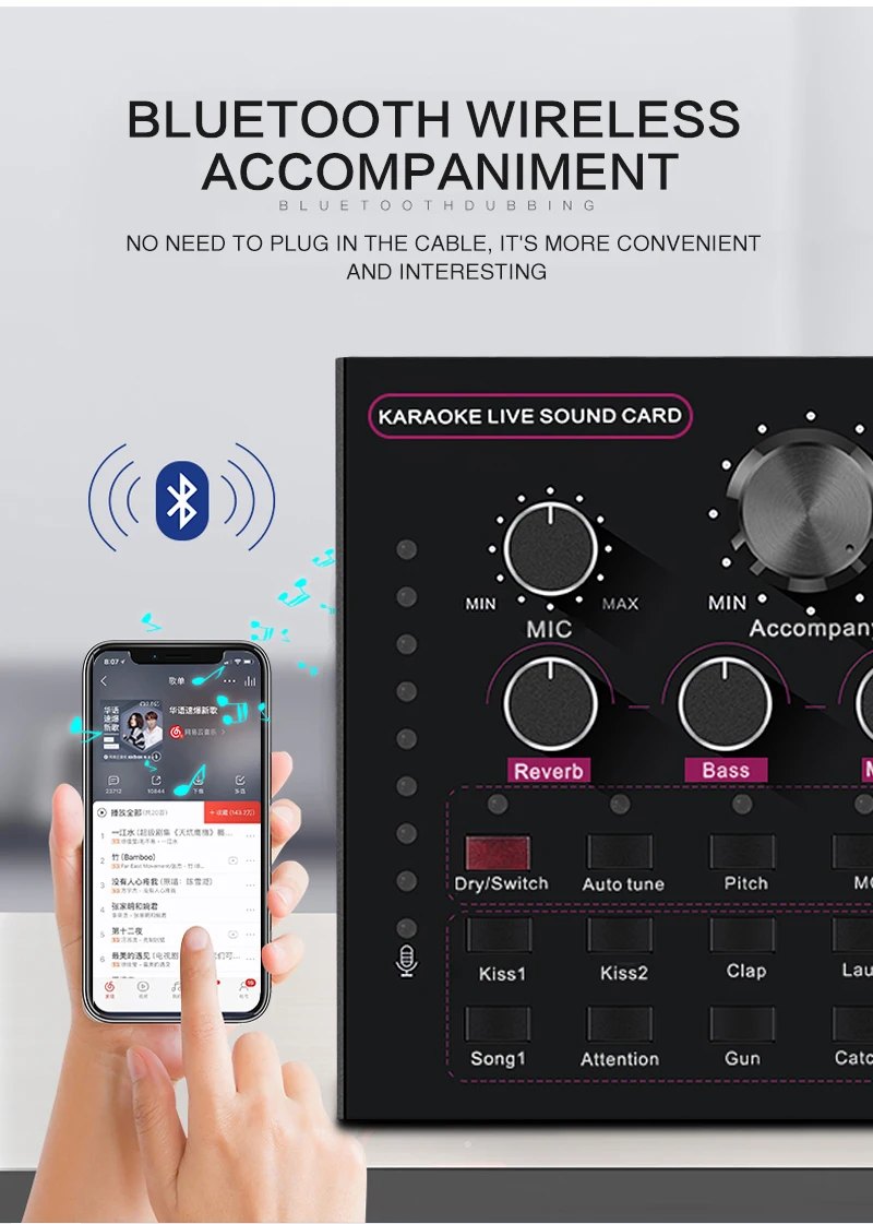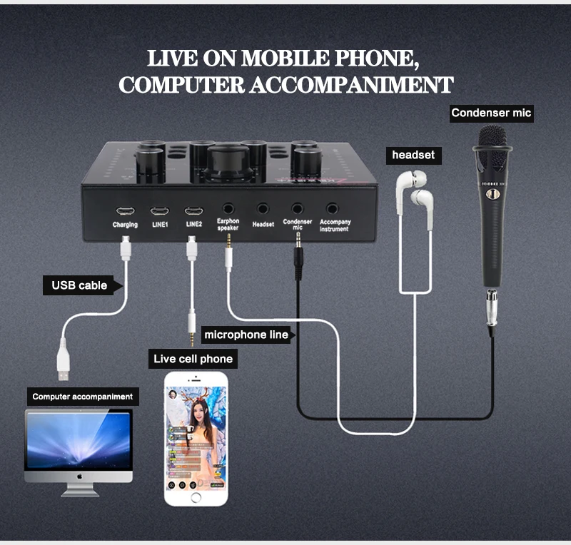 Функция: Электронная звуковая карта V12 для прямого эфира, изменение звука, 12 спецэффектов, несколько режимов эффекта, Регулировка размера реверберации, регулировка громкости микрофона, Регулировка низких и средних басов, регулировка громкости, регулировка громкости монитора (функция возврата уха). Поддержка мобильного телефона использования компьютера, поддержка отдельного использования гарнитуры, BT, несколько способов подключения: один мобильный телефон караоке в прямом эфире, с двумя сотовыми телефонами в прямом эфире, для мобильных телефонов, компьютеров, в прямом эфире, однокомпьютерная прямая трансляция, компьютерное сопровождение мобильного телефона Прямая трансляция, музыкальный инструмент ввод мобильного телефона Прямая трансляция.
