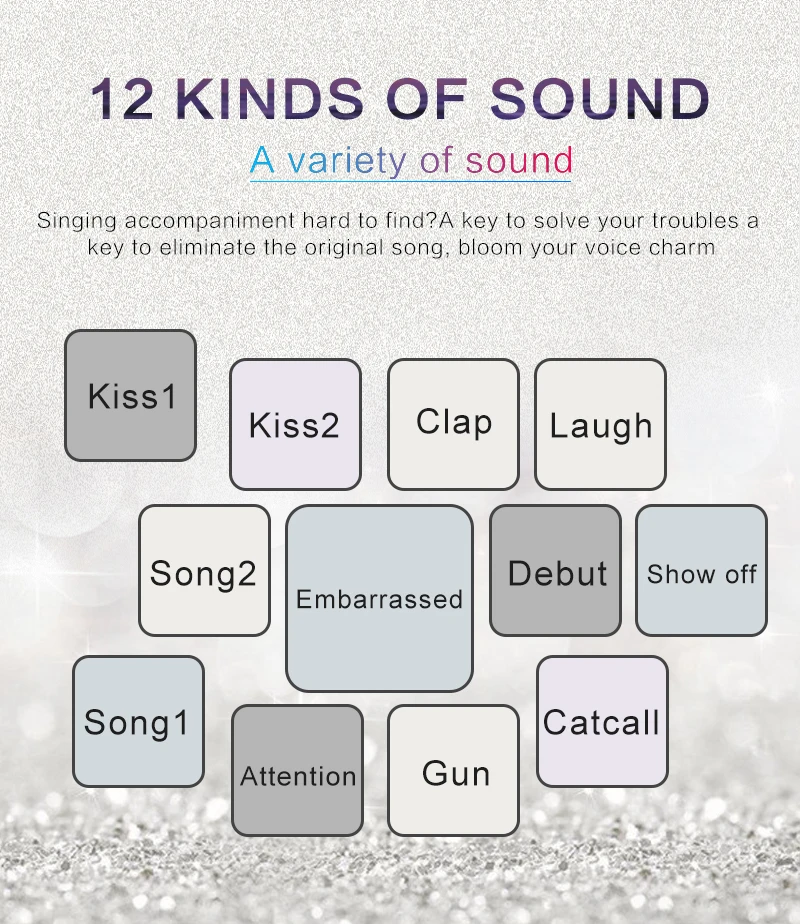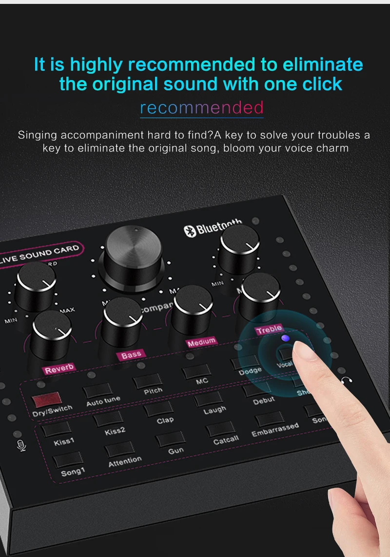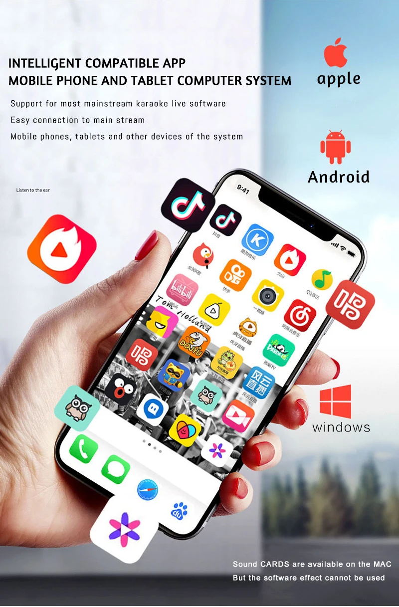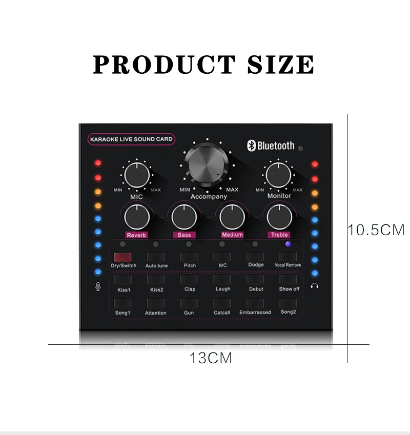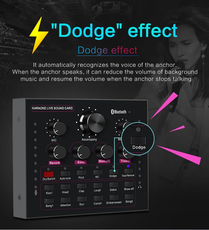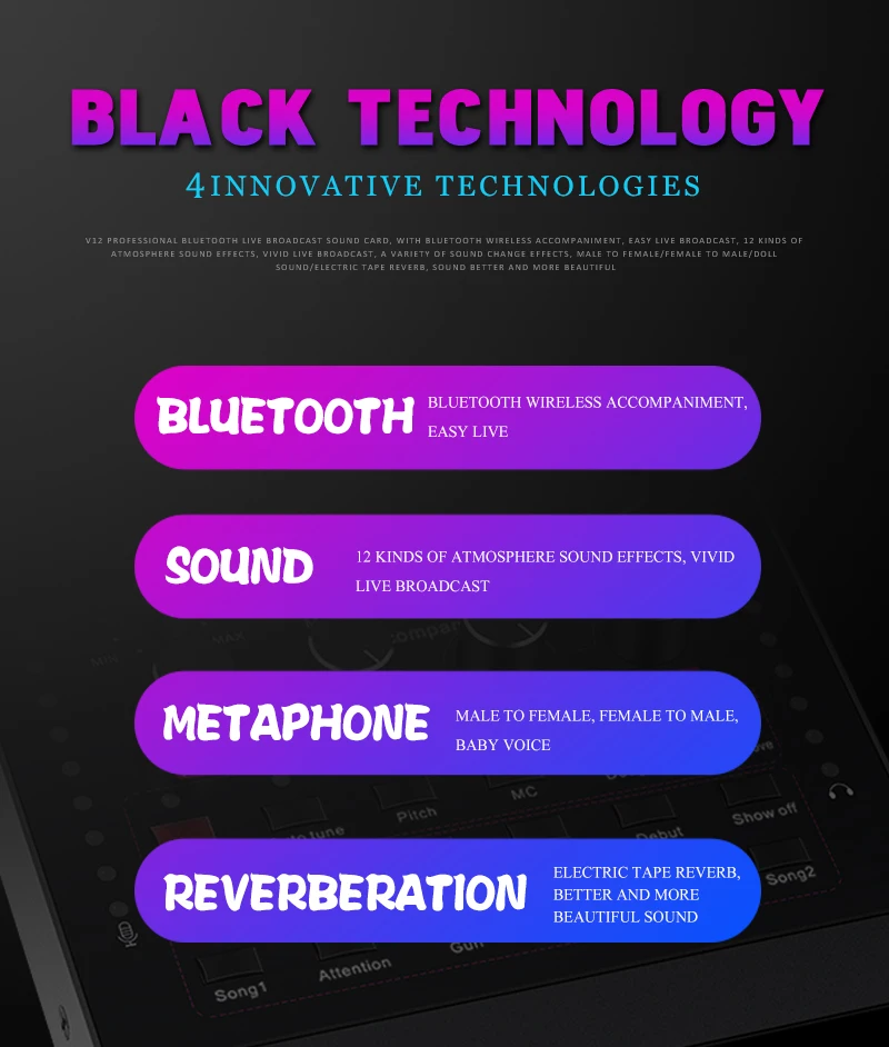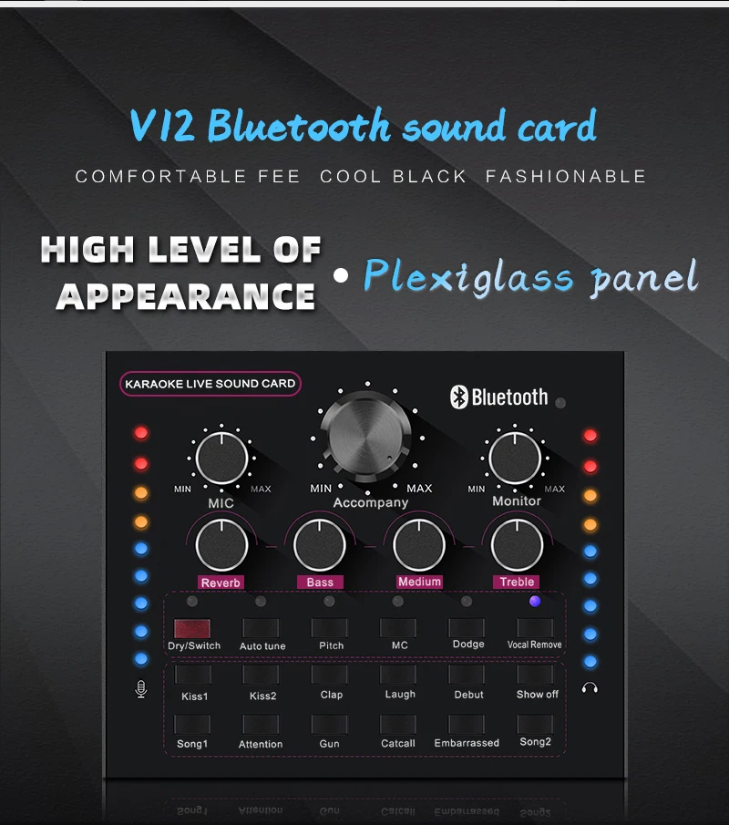 Функция: Электронная звуковая карта V12 для прямого эфира, изменение звука, 12 спецэффектов, несколько режимов эффекта, Регулировка размера реверберации, регулировка громкости микрофона, Регулировка низких и средних басов, регулировка громкости, регулировка громкости монитора (функция возврата уха). Поддержка мобильного телефона использования компьютера, поддержка отдельного использования гарнитуры, BT, несколько способов подключения: один мобильный телефон караоке в прямом эфире, с двумя сотовыми телефонами в прямом эфире, для мобильных телефонов, компьютеров, в прямом эфире, однокомпьютерная прямая трансляция, компьютерное сопровождение мобильного телефона Прямая трансляция, музыкальный инструмент ввод мобильного телефона Прямая трансляция.