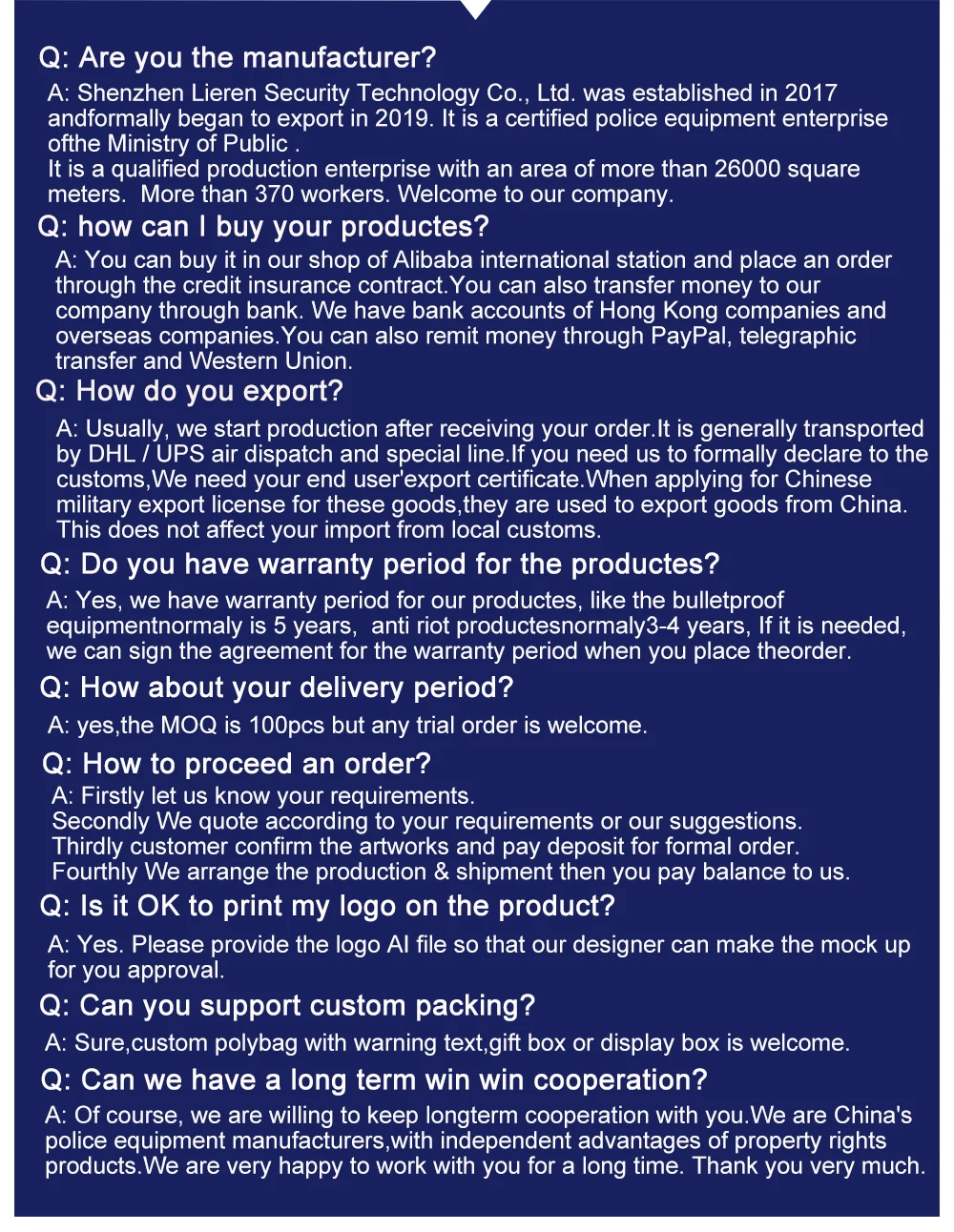 Payment terms: | T/T Western union. Paypal are accepted 40% deposit before production, balance and shipping cost before delivery | ||||||