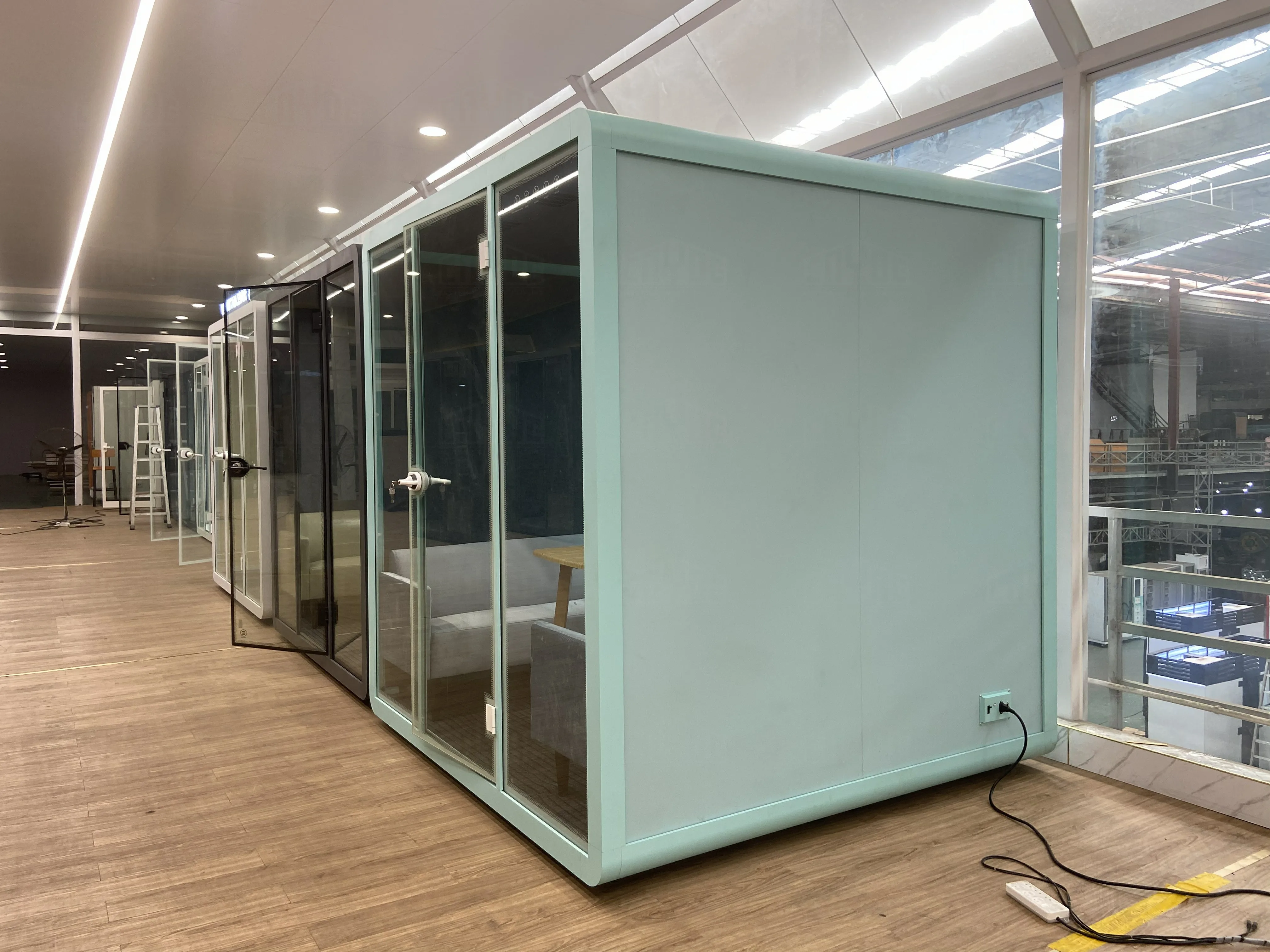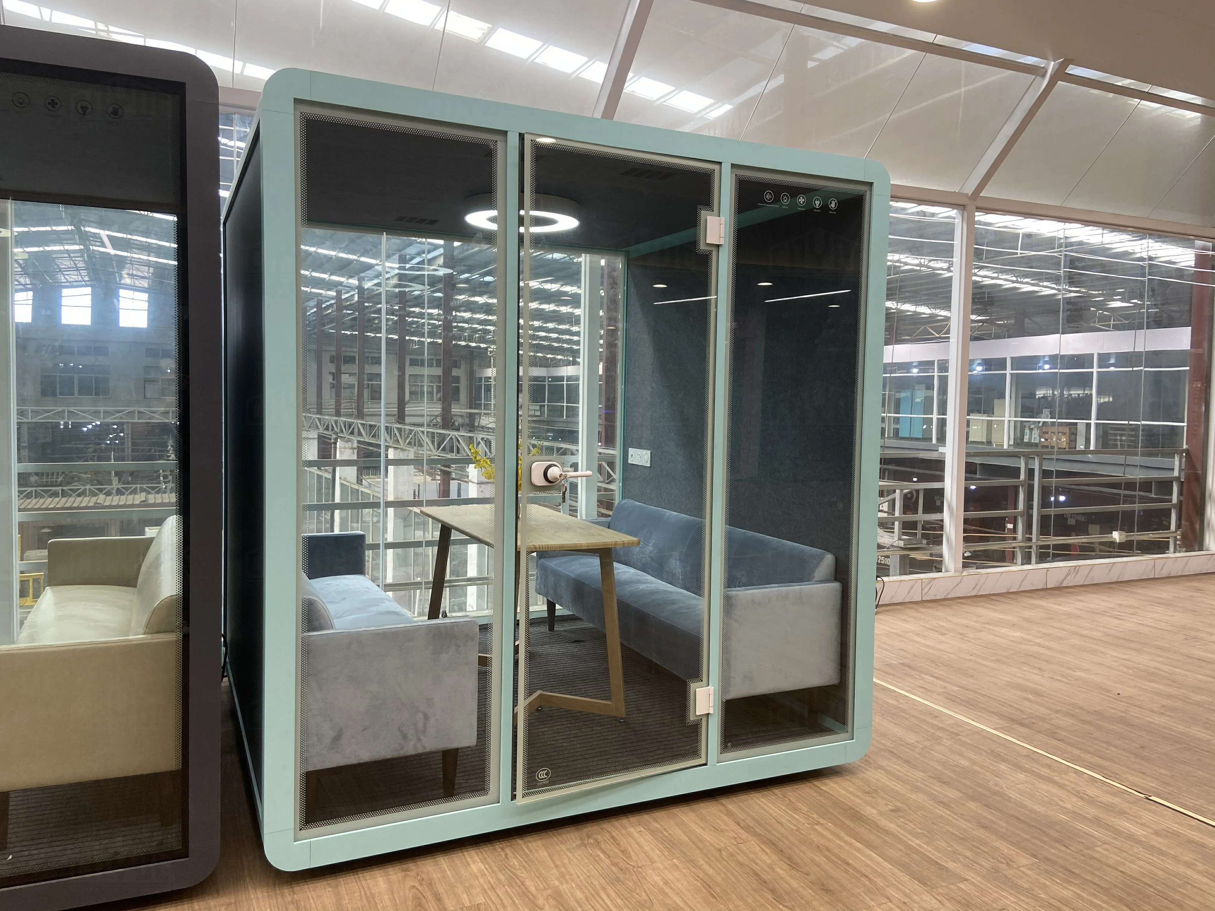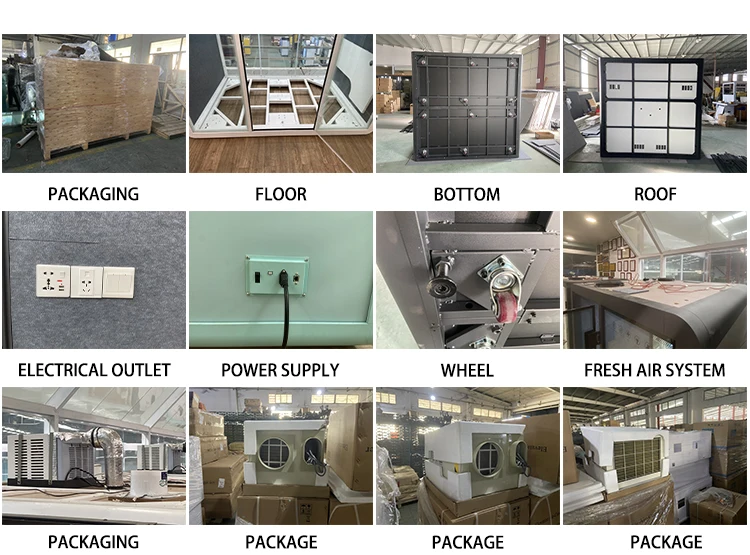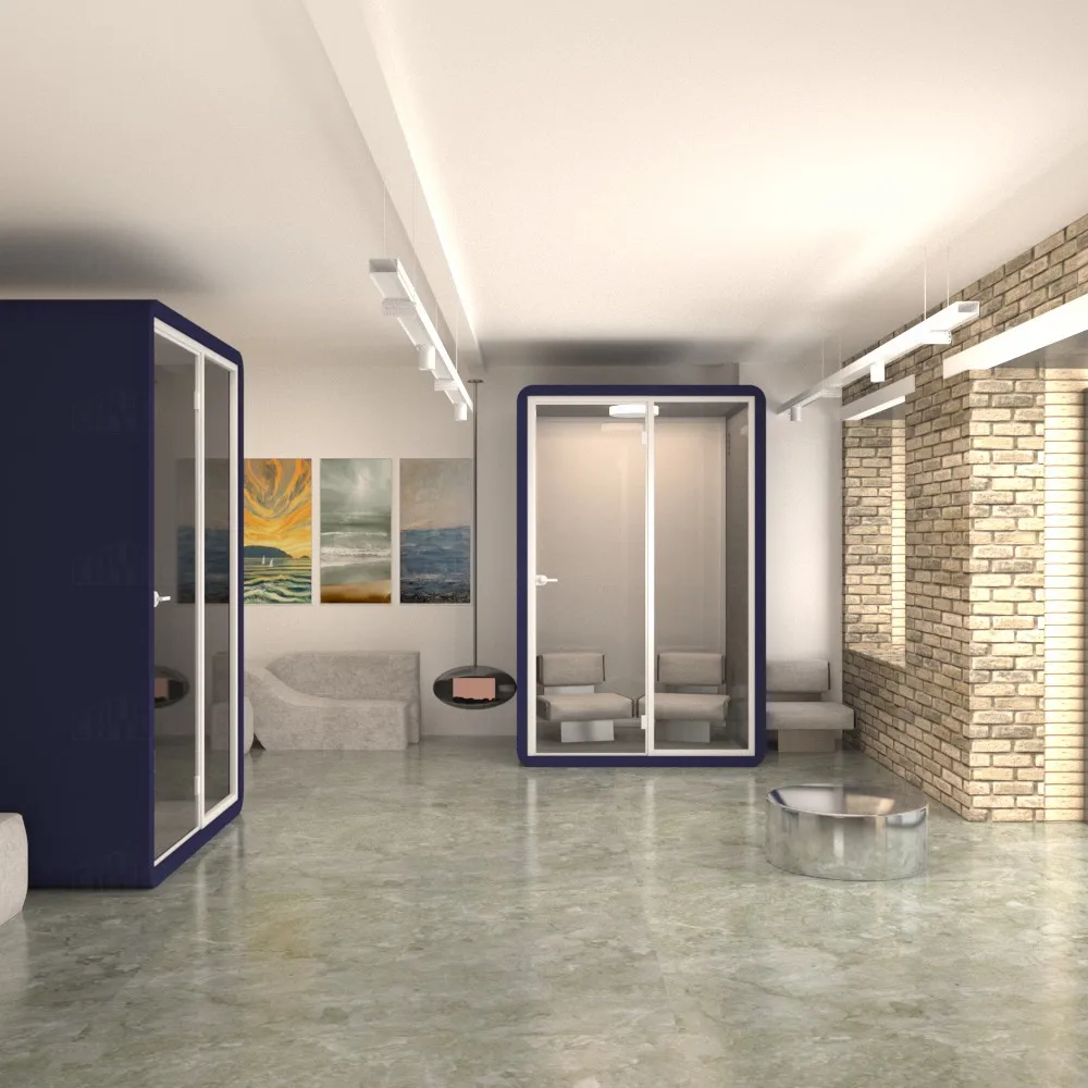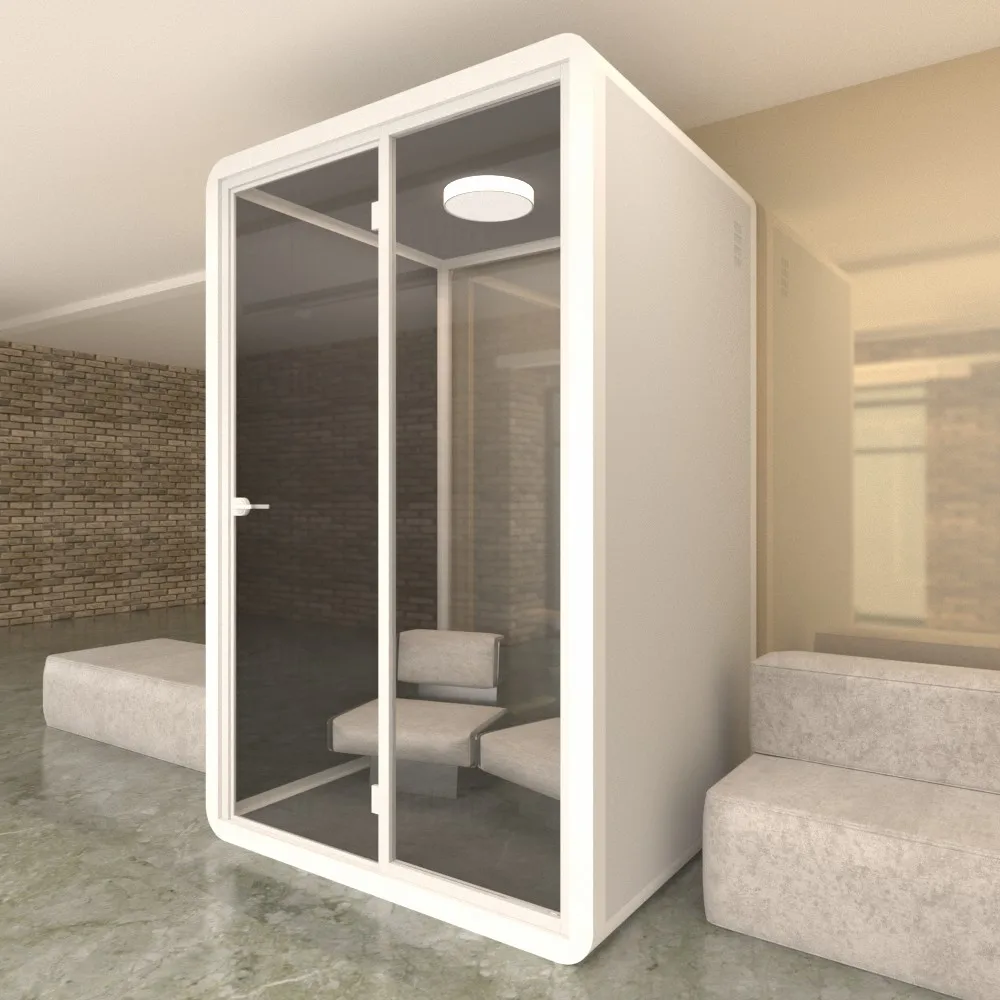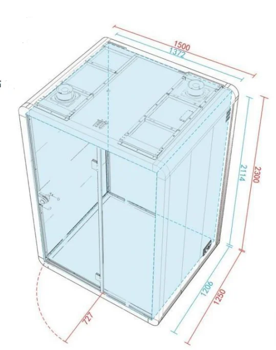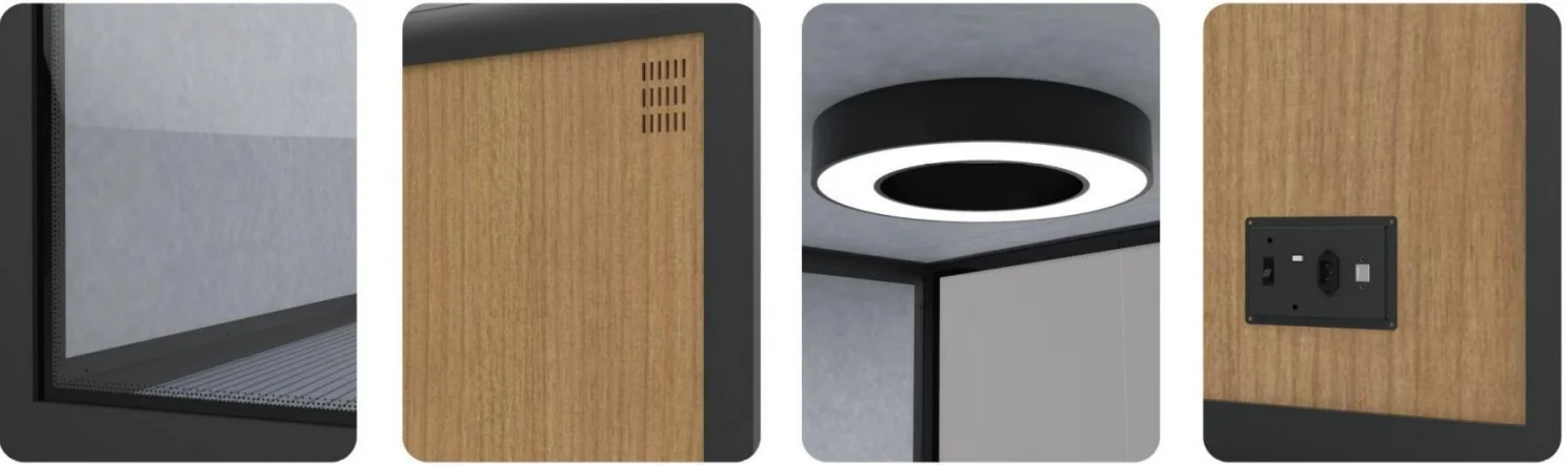The soundproof room wall is composed of sound-absorbing cotton +bamboo fiberboard (hollow st-ructure) and 10mm-thick soundproof tempered g-lass. The sound insulation and noise reduction in-dex meets the design expectations. | Each soundproof room is designed with a labyrinth type low-noise fresh air system, which can update the indoor air in 3-5 minutes. Large-size soundproof are also equipped with air-conditioning. | The booth body is equipped with 6000K three-color temperature 220V LED ceiling lights, which can basically meet the lighting needs in the booth. | Every Booth is equipped with 100-240V / 50-60 Hz and 12V-USB power supply system, which can easily meet the use of mainstream electrical appliances in life | |||