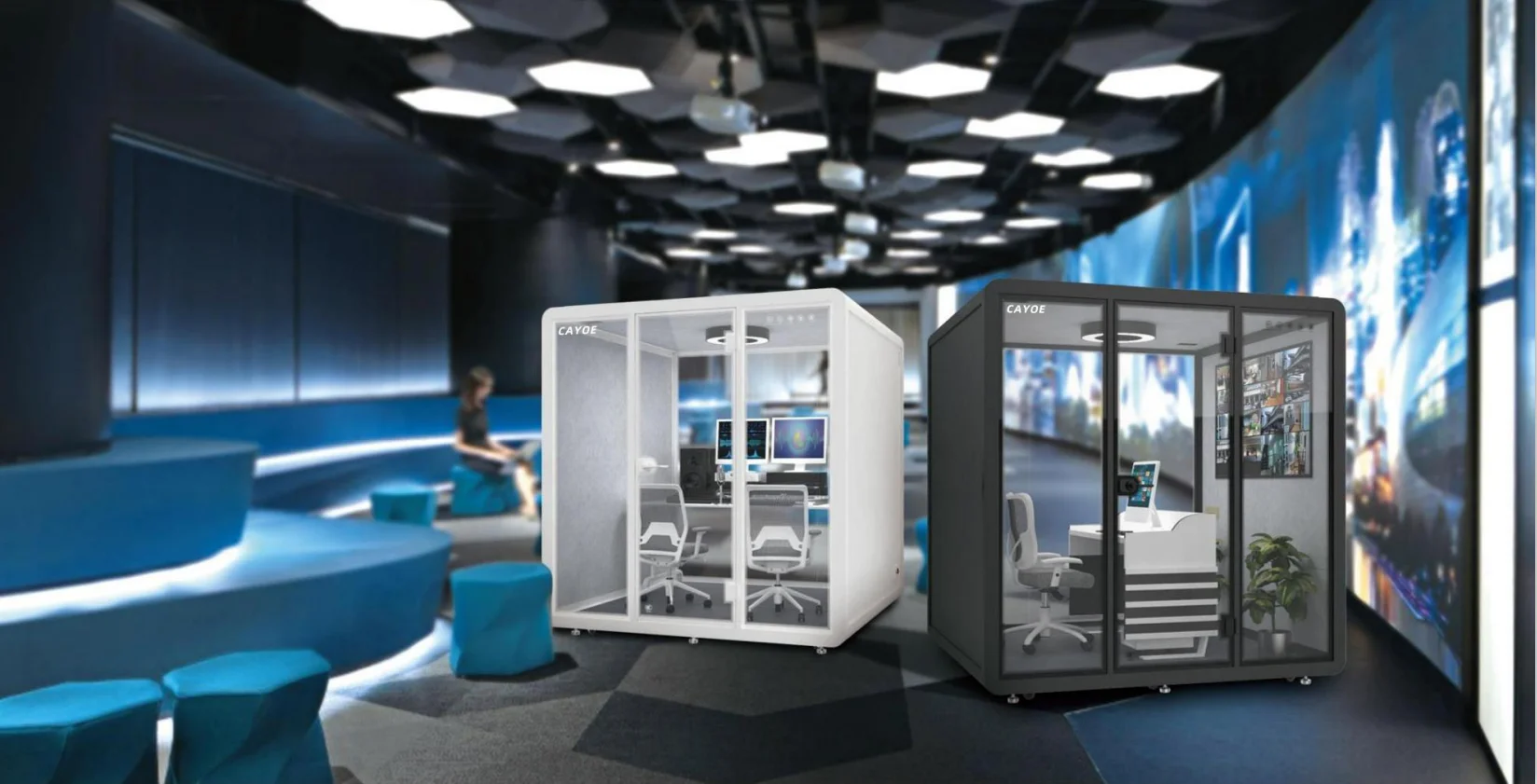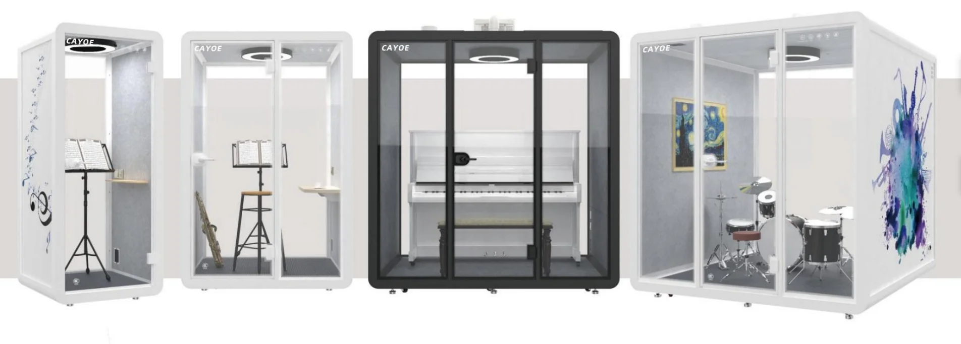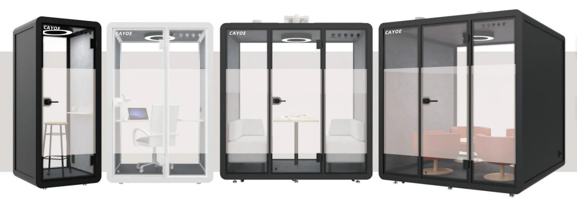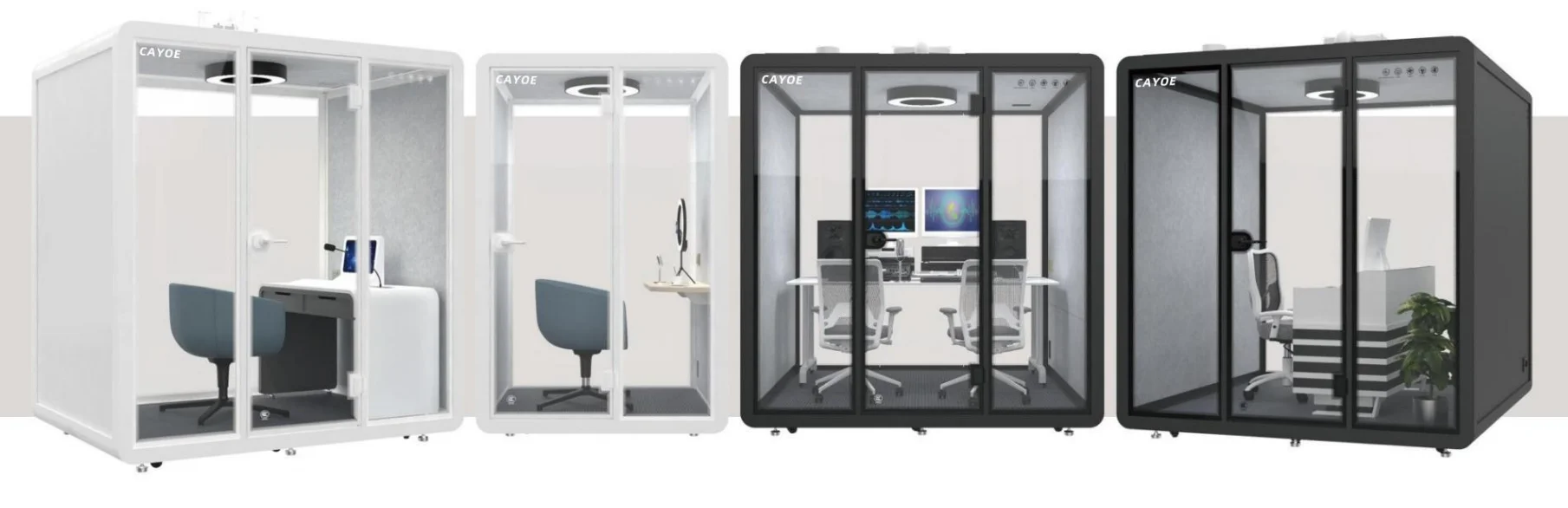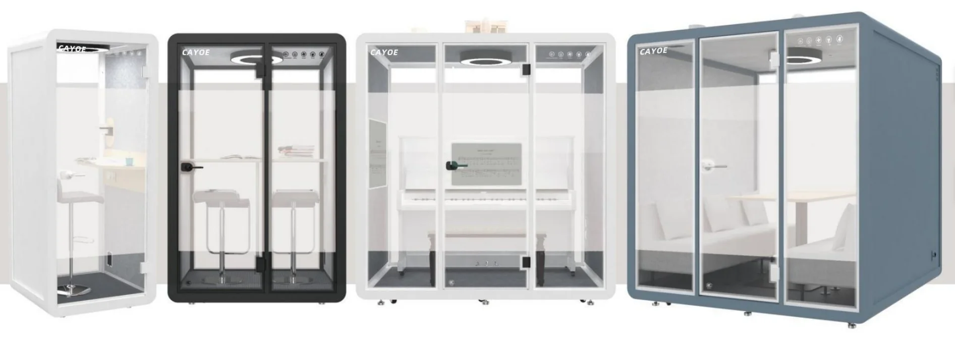 The soundproof room wall is composed of sound-absorbing cotton +bamboo fiberboard (hollow st-ructure) and 10mm-thick soundproof tempered g-lass. The sound insulation and noise reduction in-dex meets the design expectations. | Each soundproof room is designed with a labyrinth type low-noise fresh air system, which can update the indoor air in 3-5 minutes. Large-size soundproof are also equipped with air-conditioning. | The booth body is equipped with 6000K three-color temperature 220V LED ceiling lights, which can basically meet the lighting needs in the booth. | Every Booth is equipped with 100-240V / 50-60 Hz and 12V-USB power supply system, which can easily meet the use of mainstream electrical appliances in life | |||