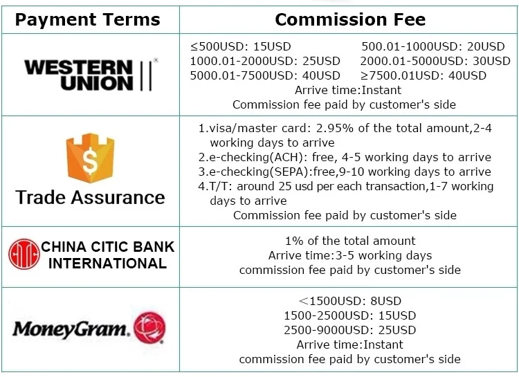 A5: Bank transfer, Western Union, Moneygram, Trade Assurance on Alibaba.