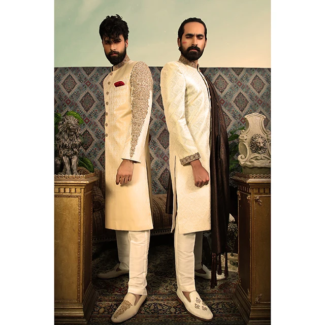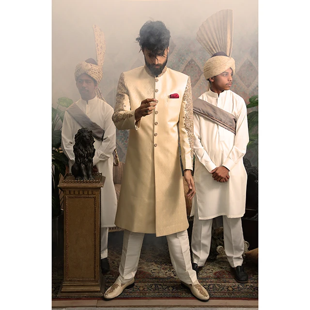 Golden Jamawar Sherwani for Men with Fully Embellished Sleeves