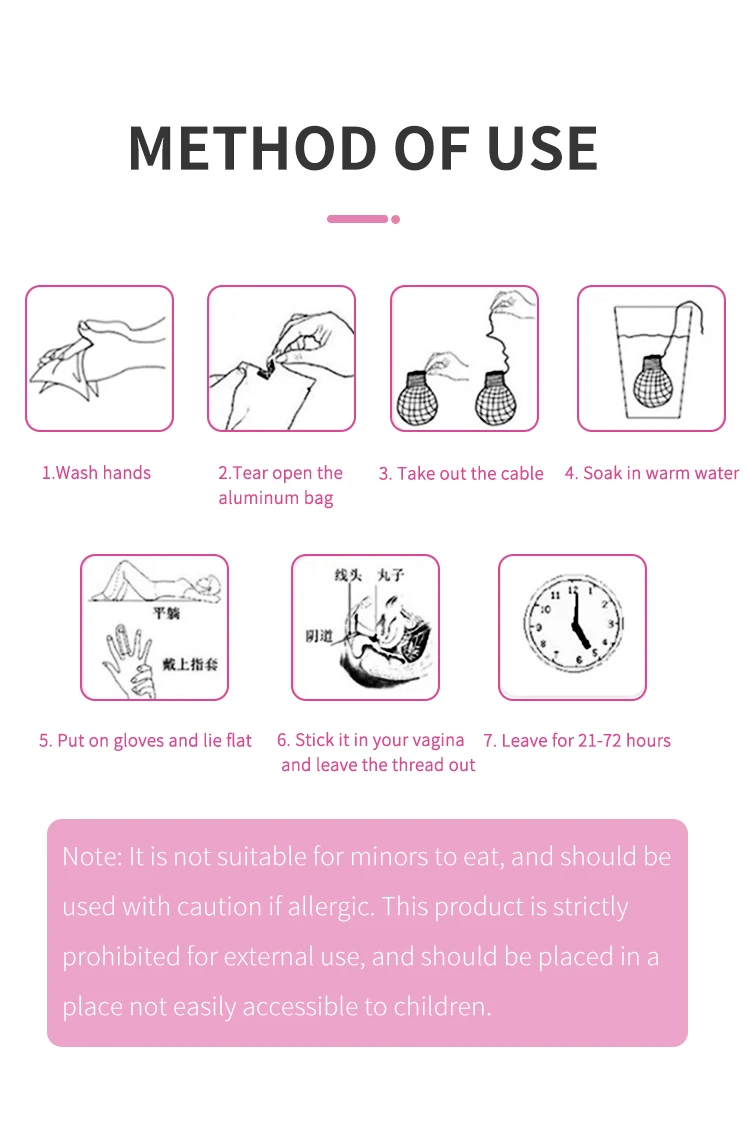 Usage | Push the pill into the deep vagina about 5-7cm, leavingthe thread in the vulva, then take it out after 3 days and rest for 2 days,stop using during menstruation (start using 3 days after menstruation). |