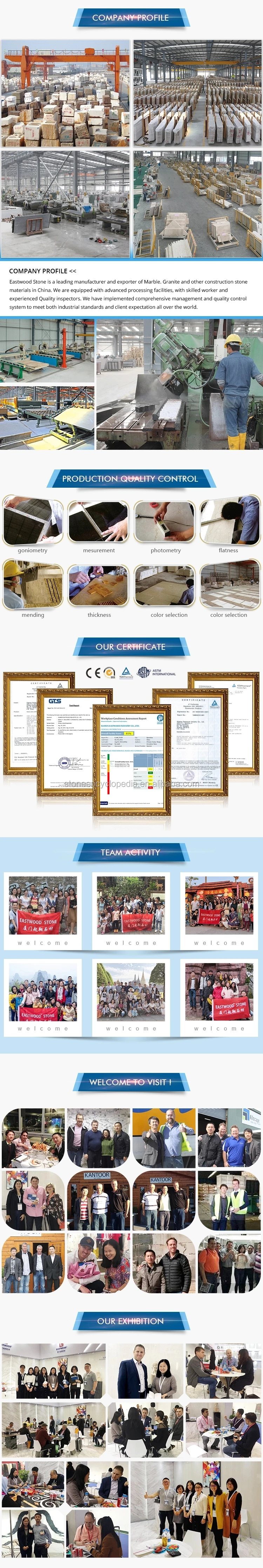 Xiamen Eastwood Stone Co., Ltd., as a leading manufacturer and exporter of all kinds of natural stone products in China, has two quarries and three processing factories. Equipped with advanced processing facilities, professional workers and experienced quality inspectors, we have implemented comprehensive management and quality control systems to meet both industrial standards and clients' expectations.