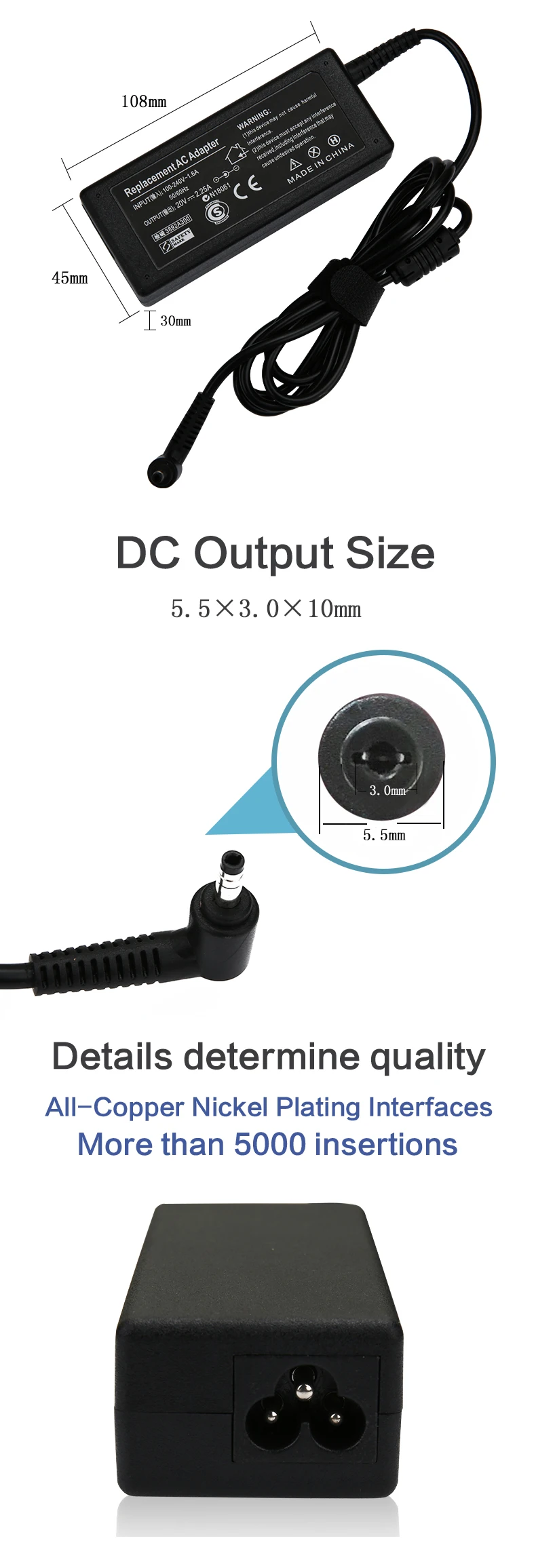 AC specification | Three plug 3PIN C6 2PIN C8 | Device type | Desktop adapter | |||||||||||||