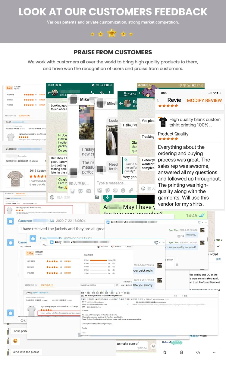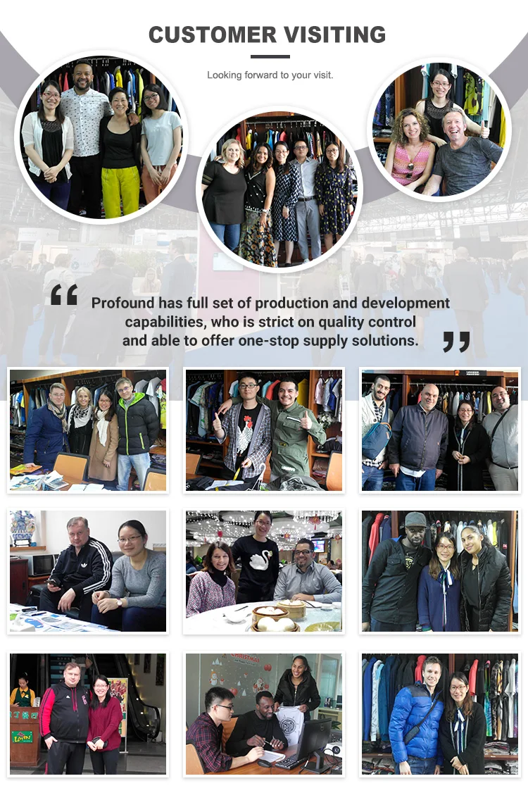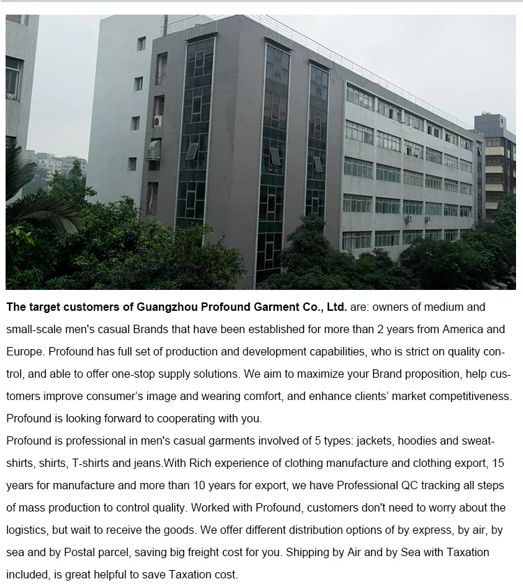 1:What is the minimal order quantity? A:Usually our MOQ is 100 pcs per design per color, mixed size (SM L XL). 2: Is the price including the shipping cost? A:The price excludes the shipping cost. Let me know your delivery address to help us checking the shipping cost for your reference please. 3:What are your main products? A:Our main products are Jackets and coats, hoodies and sweatshirts, Shirts, T-shirts and jeans. 4:What are your payment terms? A:30% deposit in advance and 70% in the period of shipment. L/C, TA and Western union payment are also acceptable. 5: What is the loading port? A:The goods are usually shipped in Guangzhou and Shenzhen. 6: What is your production leading time? A:The delivery time for bulk order is 25-35 days. It is depend on the production quantity and the season. 7:Could we ask for sample to test the quality first? A:Sure, sample could be customized with your logo in your color and size you’re your evaluation. 8:What is the samples delivery time? Answer:Usually it will take 8-14 days to make the samples, or ports as your request. 9:Could you custom make the logo? A:Yes, we make OEM order, the fabric/design/ logo/ color/ size/ label and hang-tag could be custom made as customer's requirement. 10:Do customers pay for the sample charge? A:Yes, different item and design will have different cost. Please feel free to tell us your requirement to check the sample cost, which is refundable in the production.