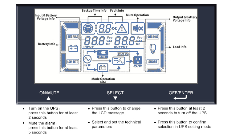 Состояние UPS, уровень нагрузки, уровень заряда батареи, Входное/выходное напряжение, Таймер разрядки и условия неисправности |
