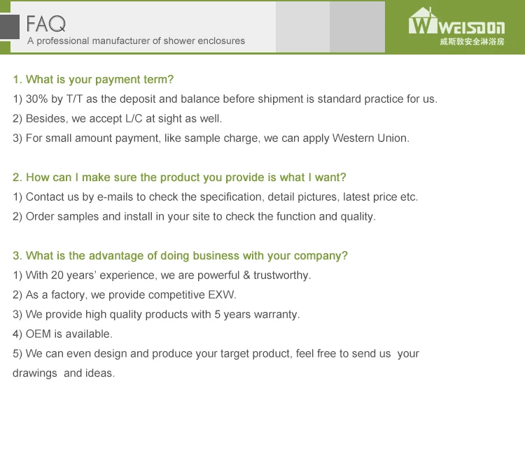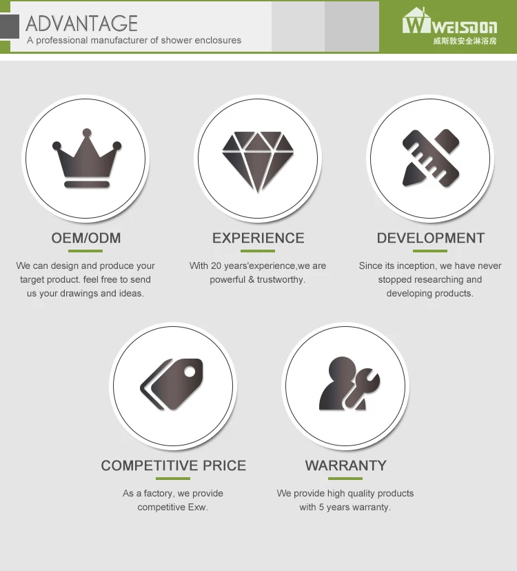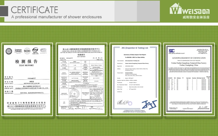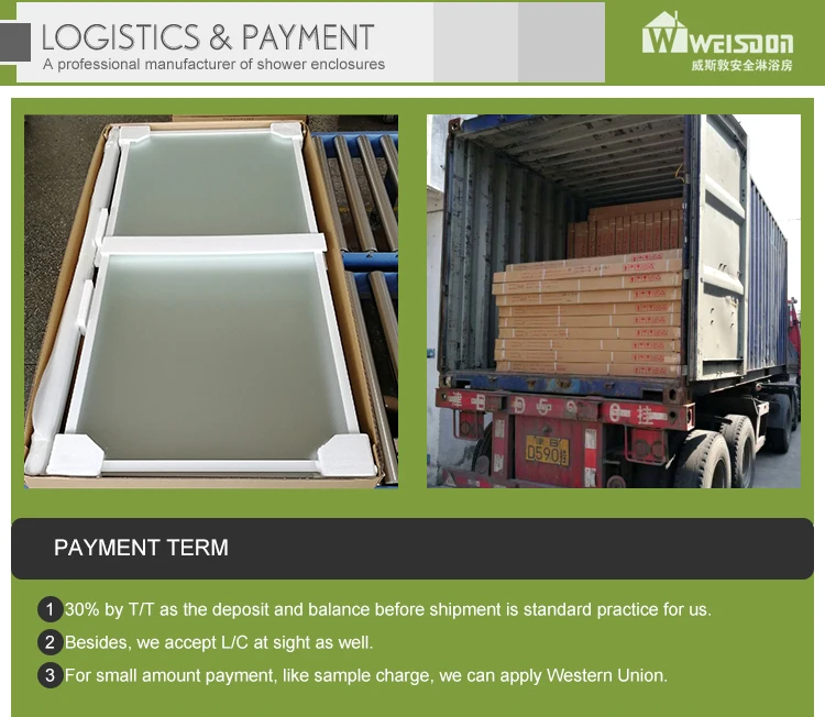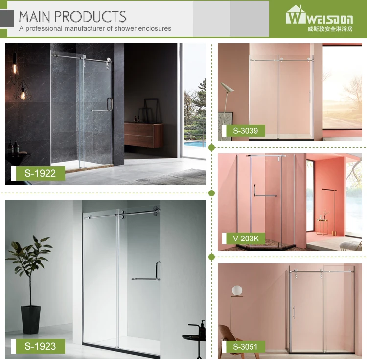 Shower enclosures | 1.Glass:6mm tempered safety glass 2.Handle: Stainless steel Handle 3.Wheels: double sliding wheel ,easy sliding 4.Surface Treatment: common painting for high gloss or Mat, PVC Membrane, Veneering |