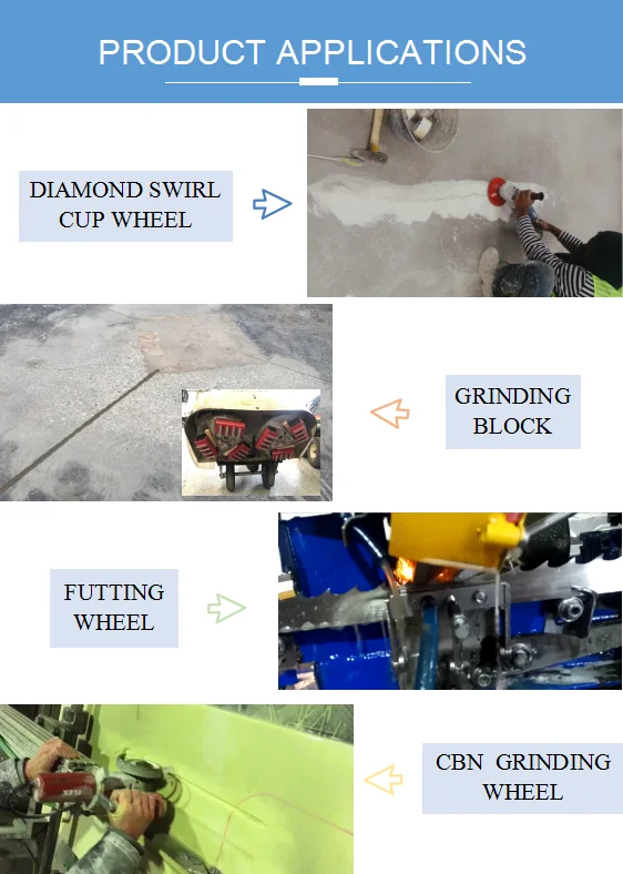 a. With silver brazed type b. Grinding speeds is very fast for stock removal and finishing stone surfaces or conrete c. Metal bond grinding wheel d. Usually install in angle grinders and floor grinding machine e. Dry and wet grinding both ok f. 22.23mm, M14 or 5/8"-11" thread is also available for easy mounting